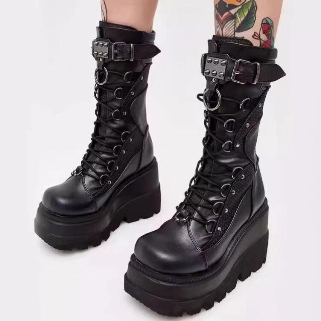 ミドルブーツ 9cmUP レディース 編み上げ かっこいい 太ヒール レディース レースアップ ショート 厚底ハイヒール ブーツ レディース ブーツ 靴 ミドルブーツ ブーツ 歩きやすい ブラック ローヒール 大きいサイズあり スクエアトゥ