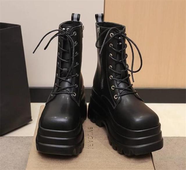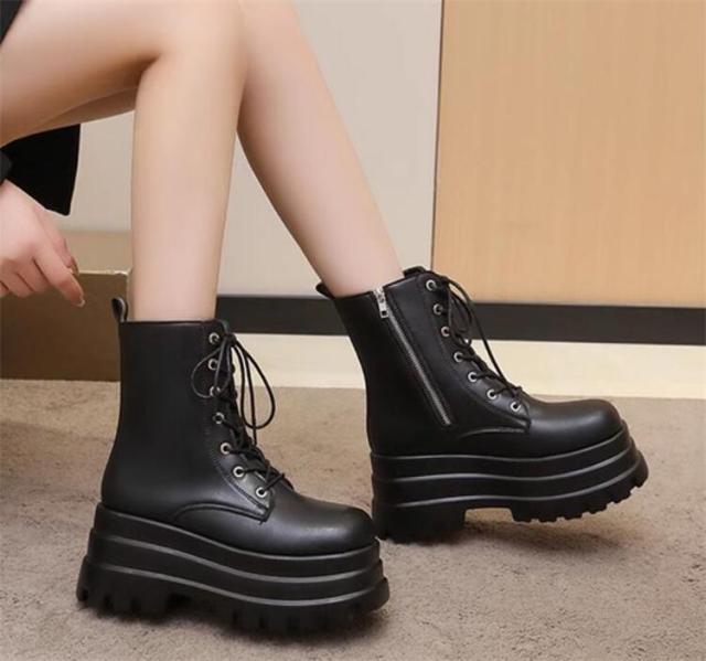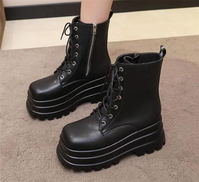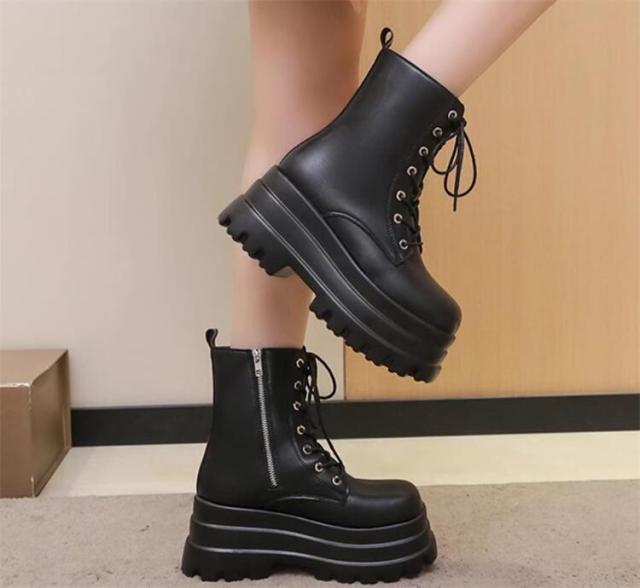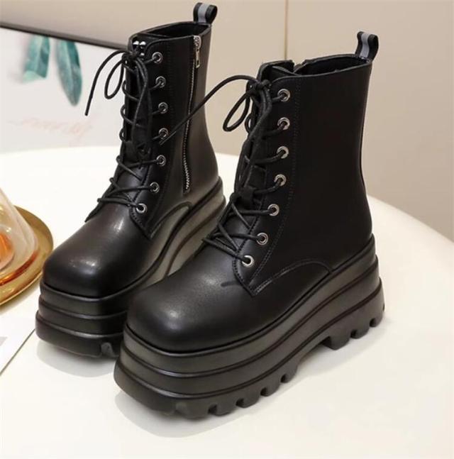 ショートブーツ 8.5cmUP レディース 編み上げ かっこいい 太ヒール レディース レースアップ ショート 厚底ハイヒール ブーツ レディース ブーツ 靴 ショートブーツ 歩きやすい ブラック ローヒール 大きいサイズあり スクエアトゥ