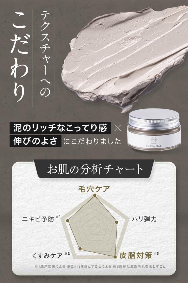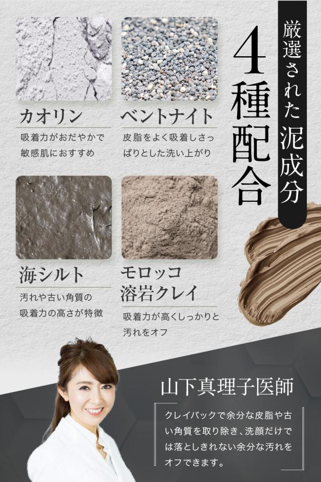 ◆ 【4種のクレイで余分な皮脂をがっつり吸着】 ベントナイト、海シルト、カオリン、モロッコ溶岩クレイと、4種のクレイ成分を独自のバランスで配合。お肌に負担をかけずに毛穴の汚れメラニンを含む古い角質を優しく落とします。