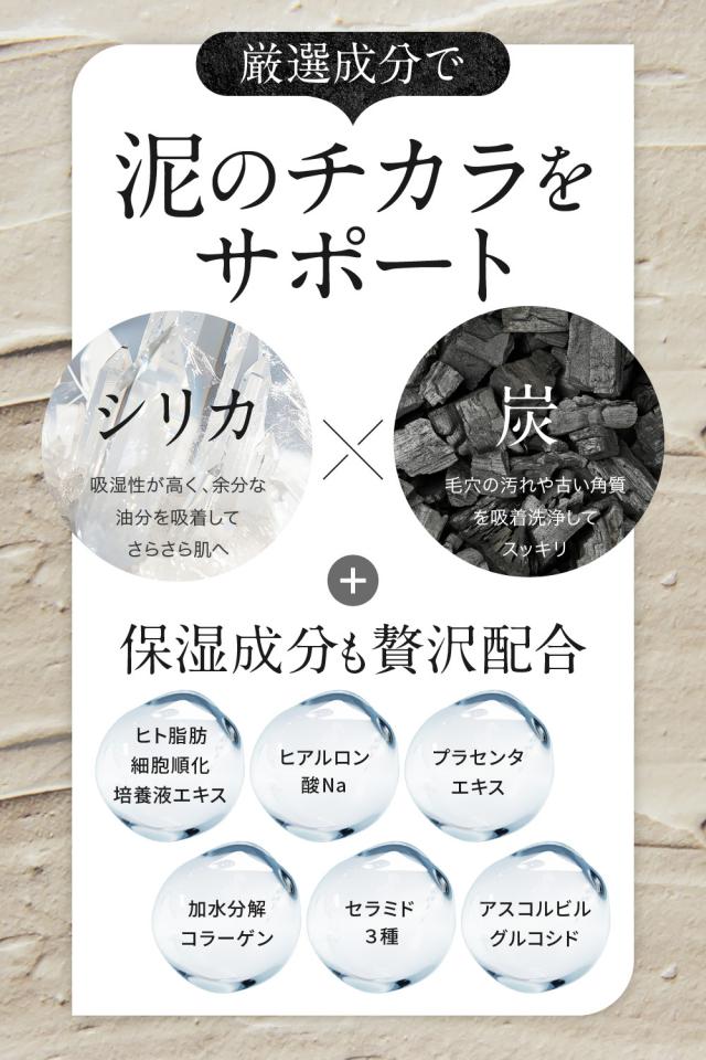 ◆ 【シリカ、炭に加えて保湿成分がたっぷり】 シリカ、炭などの厳選成分で泥のチカラをサポートします。また保湿成分として、ヒト脂肪細胞順化培養液エキス、ヒアルロン酸Na、プラセンタエキス、加水分解コラーゲン、セラミドNPセラミドNG、セラミドAP、ビタミンC誘導体も贅沢配合。