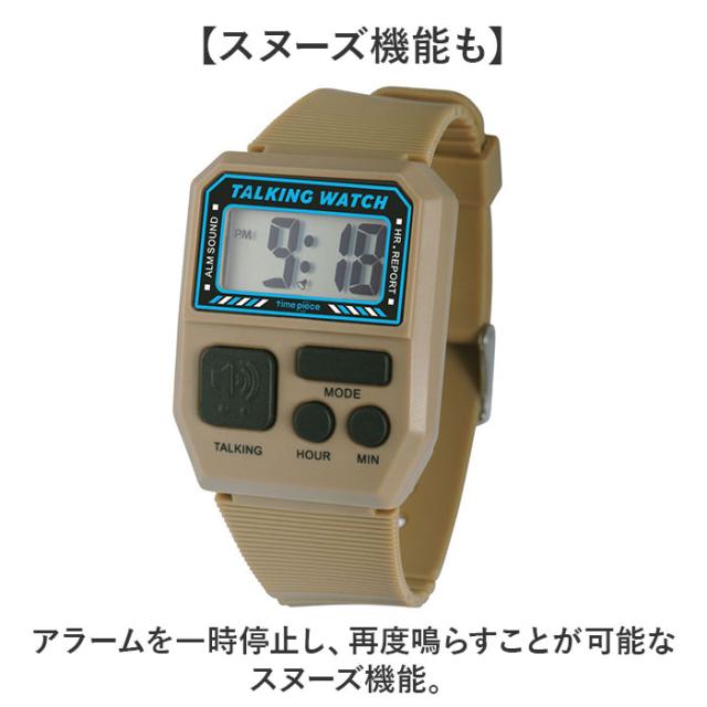 | 商品説明 | 【嬉しい時刻読み上げ付き】 ・ボタンを押して時刻を読み上げてくれるトーキングウォッチが新発売。 【正確に時間を把握】 ・TALKINGのボタンを押すだけで現在時刻を音声でお知らせ♪視覚が不自由な方でも安心☆ 【毎正時の時報付き】 ・時報機能も備わっており、毎正時に自動で音声で知らせてくれる♪ 【アラームでタスク管理を】 ・目覚ましはもちろん、予定のリマインダーにも便利なアラーム機能付きなのもポイント。 【スヌーズ機能も】 ・アラームを一時停止し、再度鳴らすことが可能なスヌーズ機能。 【使いやすいデザイン】 ・直感的に押せるボタンとシンプルな操作性でどなたでも使いやすいデザイン。 【迷わないTALKINGボタン】 ・目が不自由な方でもボタンの場所がわかりやすいよう、TALKINGボタンは大きめに設計。 【パッと見やすい文字盤】 ・シンプルな文字盤に時刻が大きくくっきりと表示されるので視認性もアリ◎ 【疲れにくい軽さ】 ・軽い作りなので、付けたままでも作業がしやすく疲れにくい。 【ユニセックスで使える】 ・ベーシックなカラー展開で装飾もシンプルなので男女関係なく使えるのもGOOD。 |