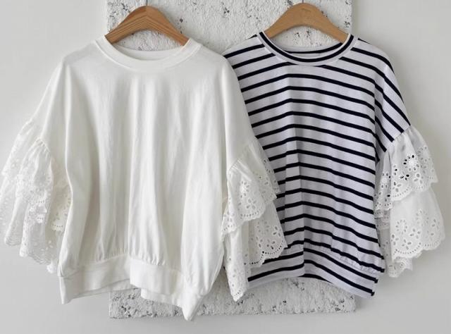 【レース袖☆レディース レース 切り替えトップス】トップス カットソー 半袖 レディース 五分袖 ボーダー 切り替えデザイン レース 春 夏 秋 カジュアル 可愛い ナチュラル Tシャツ 20代 30代 40代 韓国ファッション 送料無料
