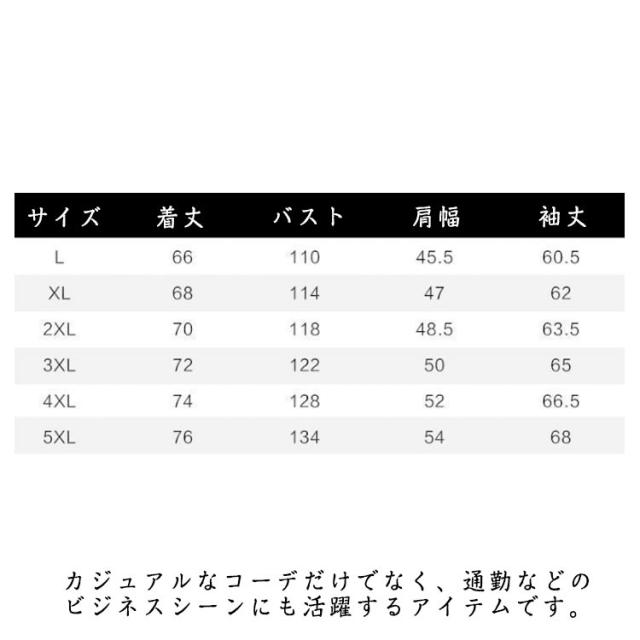 | サイズについての説明 | M着丈64バスト106肩幅45.5袖丈60.5おすすめ体重45-53KG L着丈66バスト110肩幅47袖丈62おすすめ体重53-58KG XL着丈68バスト114肩幅48.5袖丈63.5おすすめ体重58-63KG 2XL着丈70バスト118肩幅50袖丈65おすすめ体重63-70KG 3XL着丈72バスト122肩幅52袖丈66.5おすすめ体重70-78KG 4XL着丈74バスト128肩幅54袖丈68おすすめ体重75-83KG 5XL着丈76バスト134肩幅56袖丈69.5おすすめ体重83-90KG ※サイズは平置き実寸になります。 サイズ表の実寸法は商品によって1-3cm程度の誤差がある場合がございます |