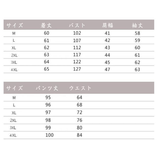 | サイズについての説明 | M着丈60バスト102肩幅41袖丈58パンツ丈95ウエスト64おすすめ体重38-50kg L着丈61バスト107肩幅42袖丈59パンツ丈96ウエスト68おすすめ体重50-58kg XL着丈62バスト112肩幅43袖丈60パンツ丈97ウエスト72おすすめ体重58-65kg 2XL着丈63バスト117肩幅44袖丈61パンツ丈98ウエスト76おすすめ体重65-73kg 3XL着丈64バスト122肩幅45袖丈62パンツ丈99ウエスト80おすすめ体重73-80kg 4XL着丈65バスト127肩幅47袖丈63パンツ丈100ウエスト84おすすめ体重80-90kg ※サイズは平置き実寸になります。 サイズ表の実寸法は商品によって1-3cm程度の誤差がある場合がございます |