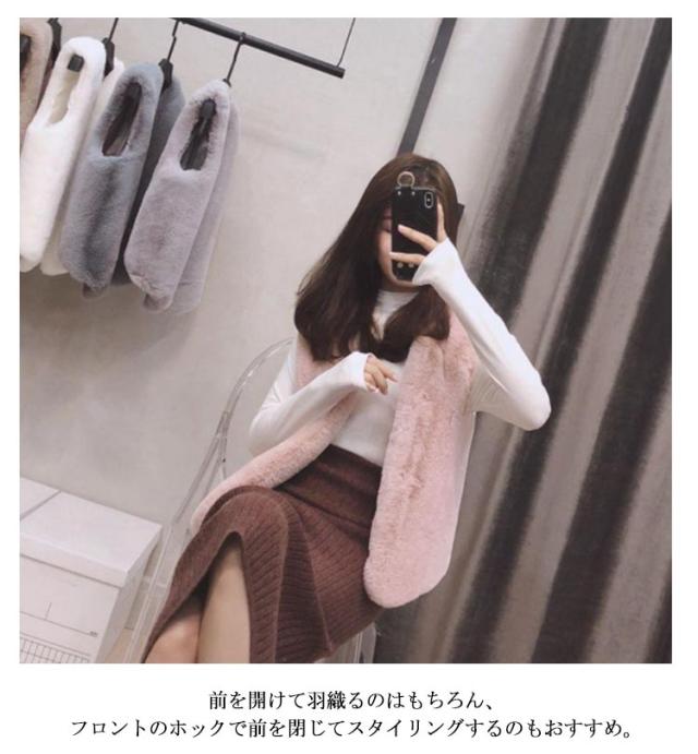 | ふわふわのフェイクファーで、 存在感がありながらも上品な印象に。 程よいボリューム感でデイリー使いもしやすく 羽織りやすい軽さも魅力的。 前を開けて羽織るのはもちろん、 フロントのホックで前を閉じてスタイリングするのもおすすめ。 お手持ちのシンプルアイテムにプラスするだけで、 旬のコーデが完成する優秀アイテムです。 | |