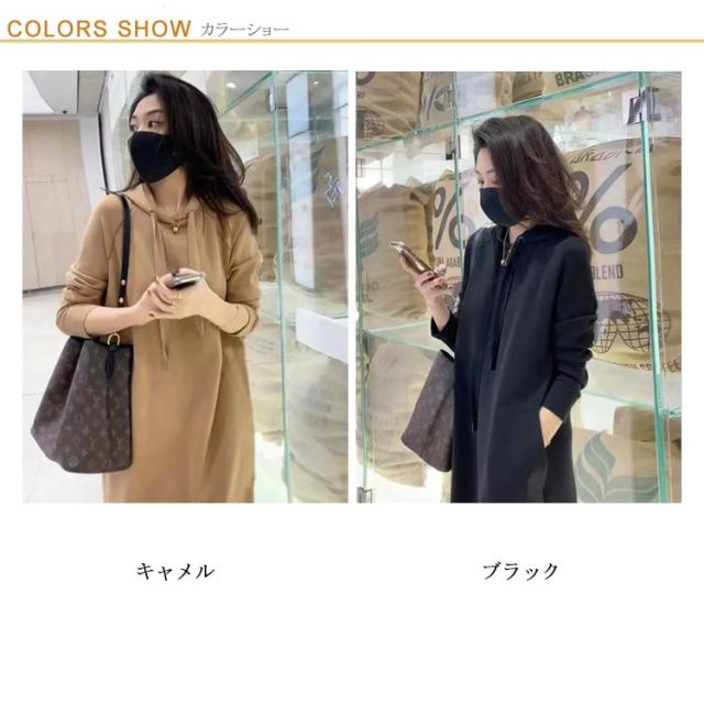 | 短すぎず長すぎない、上品な着丈、フード付きのパーカーワンピース。 少し厚みのある素材なので寒くなるまで長く使えます。 レギンス合わせもしやすく便利。 ・ポケットがついていて手を入れたりモノを入れたり便利。 | |