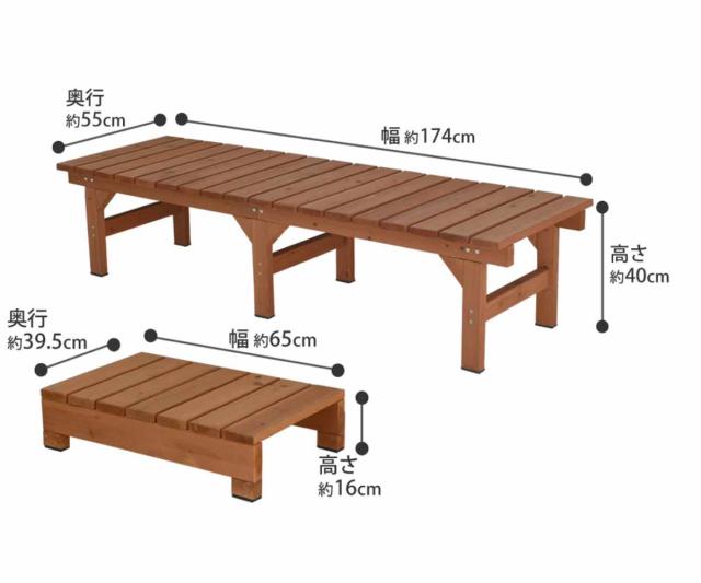 | サイズ | デッキ縁台:幅 約174×奥行55×高さ40cm 約14.2kg ステップ:幅 約65×奥行39.5×高さ16cm 約3.8kg |
