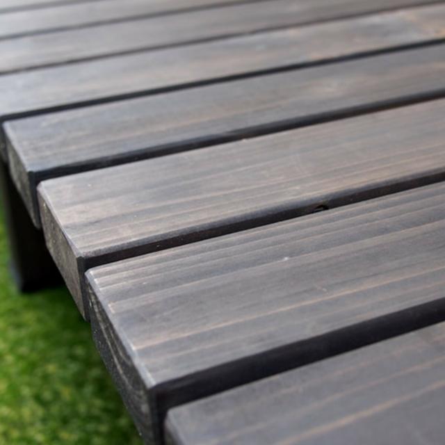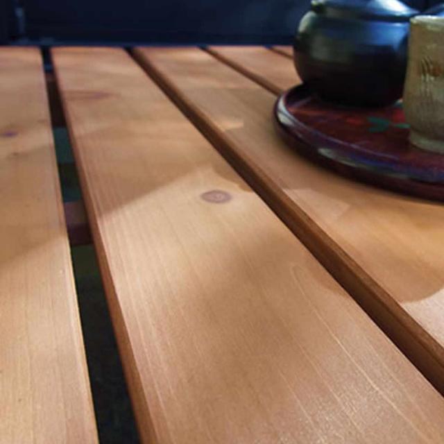 天然木素材を使用した縁台は、夏は熱すぎず冬は冷たすぎず、やわらかな座り心地が魅力です。おしゃれと実用性を兼ね備えており、天板厚は充分な厚みのある約2.5cmで、たわみも少なく安定した座り心地です。