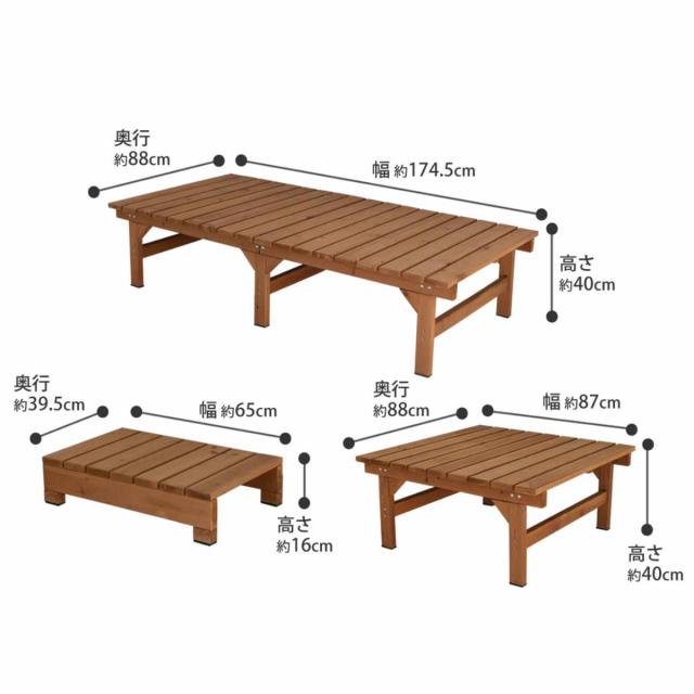 | サイズ | デッキ縁台(幅174):幅 約174.5×奥行88×高さ40cm 約19.2kg デッキ縁台(幅87):幅87×奥行88×高さ40cm 約9.8kg ステップ:幅 約65×奥行39.5×高さ16cm 約3.8kg |