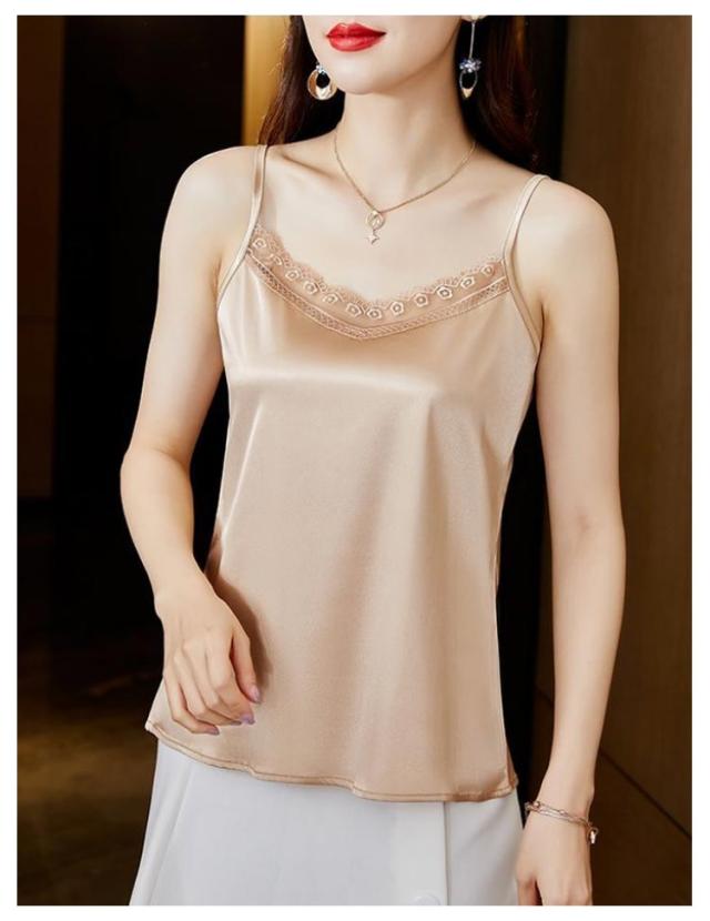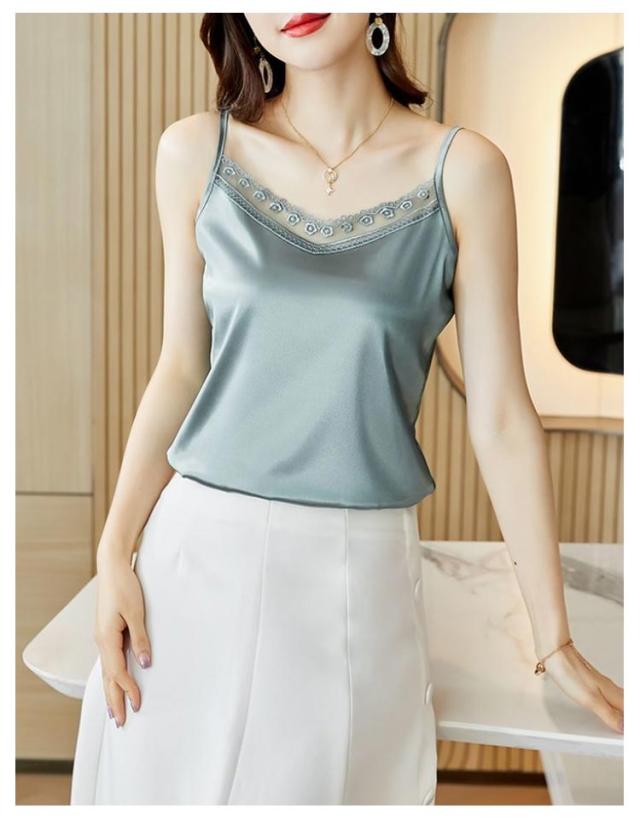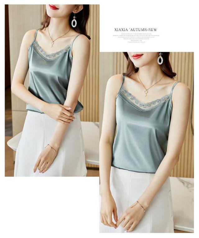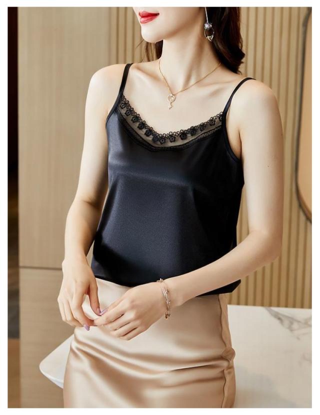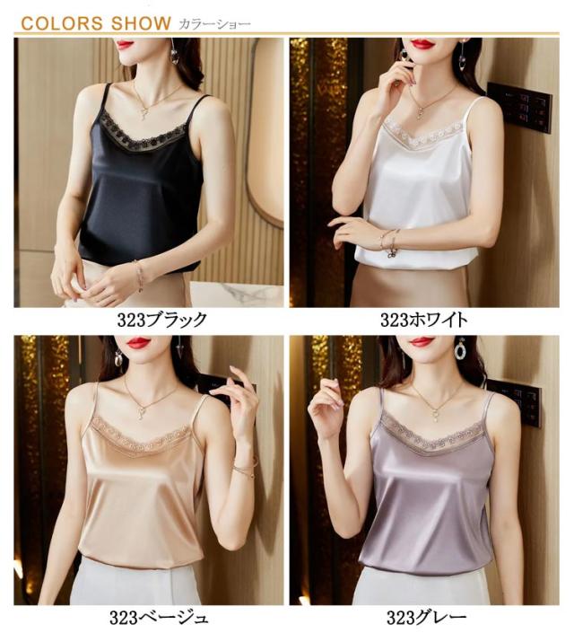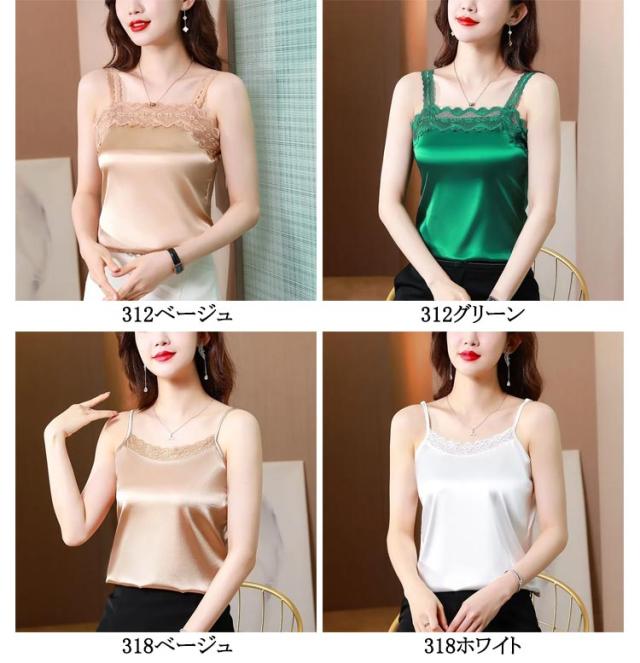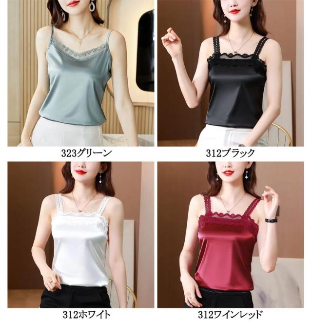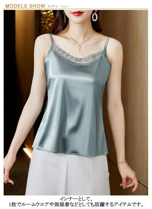 Vネック ノースリーブ 刺繍 サテンキャミ インナー キャミソール サテンキャミソール サテン ブラウス 胸元レース タンクトップ レディース エレガント 大人 トップス きれいめ 光沢感 大きいサイズ サテン おしゃれ 20代 30代 40代