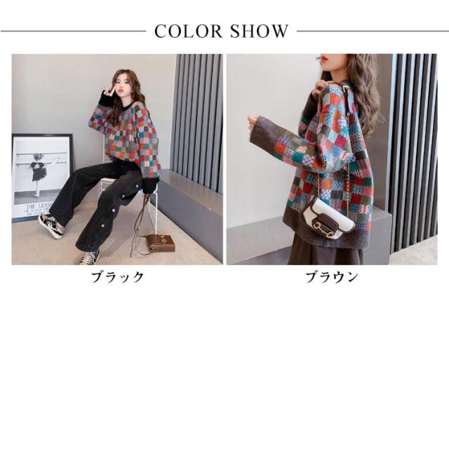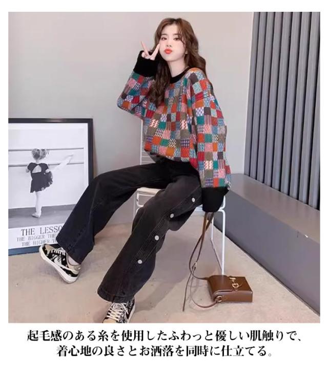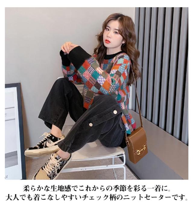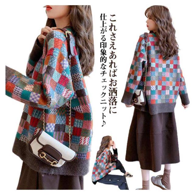 レディース トップス ドルマン チェック セーター ニットセーター チェック柄 ニット オーバーサイズ プルオーバー チュニック チェック ドロップショルダー マルチカラー 柄ニット 体型カバー カジュアル トレンド