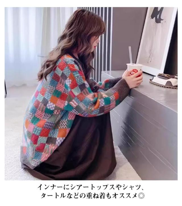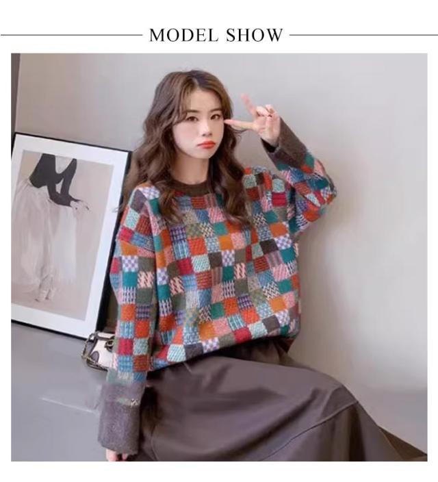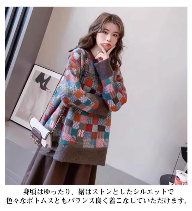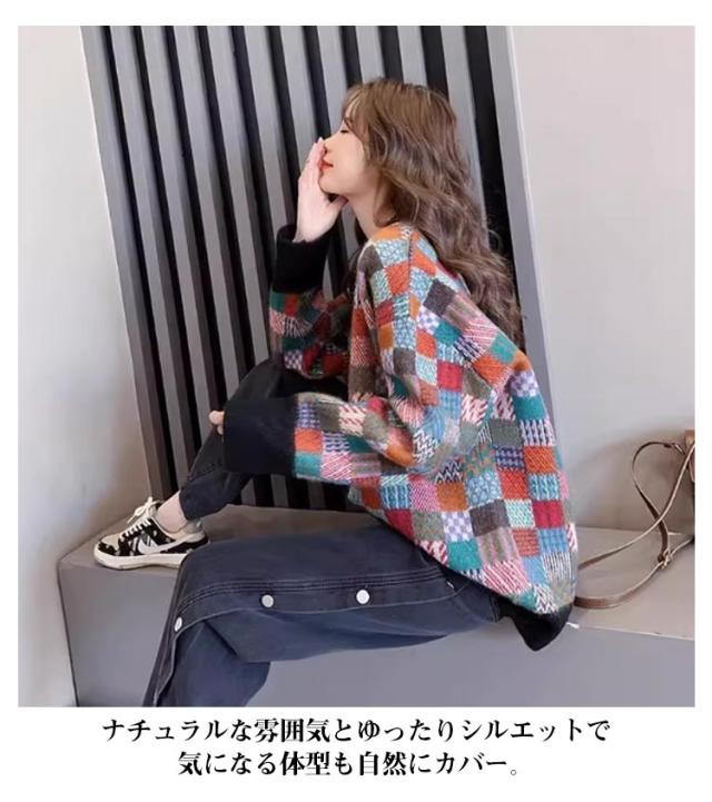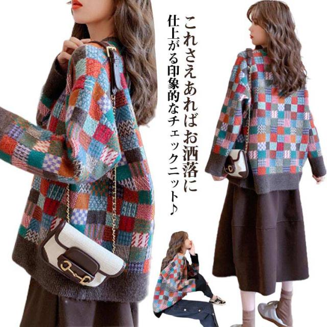 トップス ニットセーター チェック プルオーバー セーター チェック柄 レディース チェック ニットソー ニット オーバーサイズ マルチカラー ドロップショルダー チュニック 柄ニット 体型カバー カジュアル トレンド