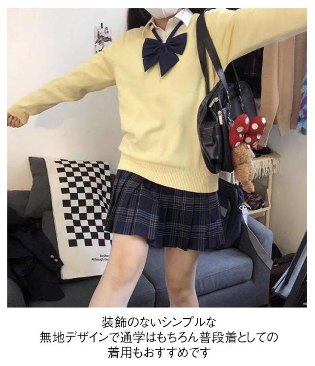 | ちくちくしない♪ふんわり柔らかなスクールセーターです。 季節の変わり目に頼れる、あたたかなニット素材。 リボンと合わせやすいちょうど良い開き具合のVネックが特徴。 装飾のないシンプルな無地デザインで通学はもちろん普段着としての着用もおすすめです♪ | |