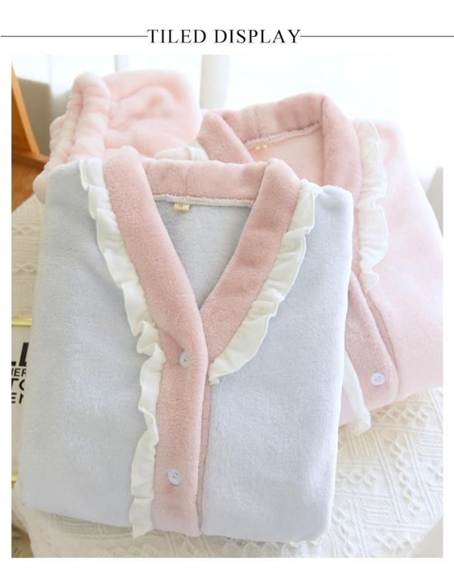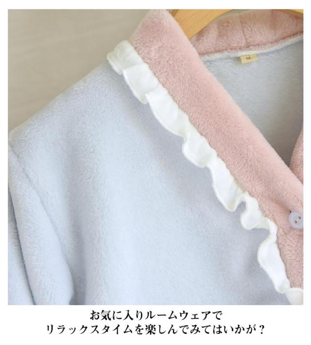| ふわふわで優しい手触りのもこもこ起毛パジャマ。 肌触りがよく、見た目よりも軽いので、フワッと着用できるので着心地は抜群! フリルレース&パイピングでシンプル過ぎずお洒落!お部屋でも可愛く過ごせちゃう♪ スマホや小物を入れておくのに欠かせないポケット付きなのも嬉しいポイント。 ウエストゴムで楽ちんリラックス♪長時間着るものだから、着心地にもこだわりを。 お気に入りルームウェアでリラックスタイムを楽しんでみてはいかが? | |