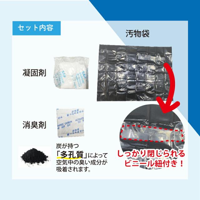 商品情報 | 【商品名】非常用トイレ 3点セット 1回分×5個 災害時の準備できていますか? 袋を取り付けて、排泄後に凝固剤と消臭剤を入れるだけ 約700cc吸水可能 ※一般的な排尿量は200〜400mlと言われています。(個人差があります。) 「可燃ごみ」として廃棄可能 紙オムツ同様必ず各自治体のルールに従ってください。 ・水不要 ・簡単取り付け ・素早く固まる ・消臭効果 ・吸水性 袋単体でもご使用いただけます。 【処理使用回数】 大便:1回使い切り 小便:2〜3回使用可能 【使い方】 1.付属の黒い汚物袋を洋式トイレ、バケツ、ゴミ箱、段ボールなどにセットします。 2.排泄後、付属の凝固剤の袋は破らずそのまま汚物の上に置き、消臭剤は袋を破り中身の粉末を汚物にかけます。 3.固まったら汚物袋に接着してあるビニール紐で口をしっかり縛って廃棄してください。 災害時以外の場面でも使用可能 渋滞・介護・アウトドア 【セット内容】 汚物袋・凝固剤・消臭剤 【仕様】 吸水:約700cc |