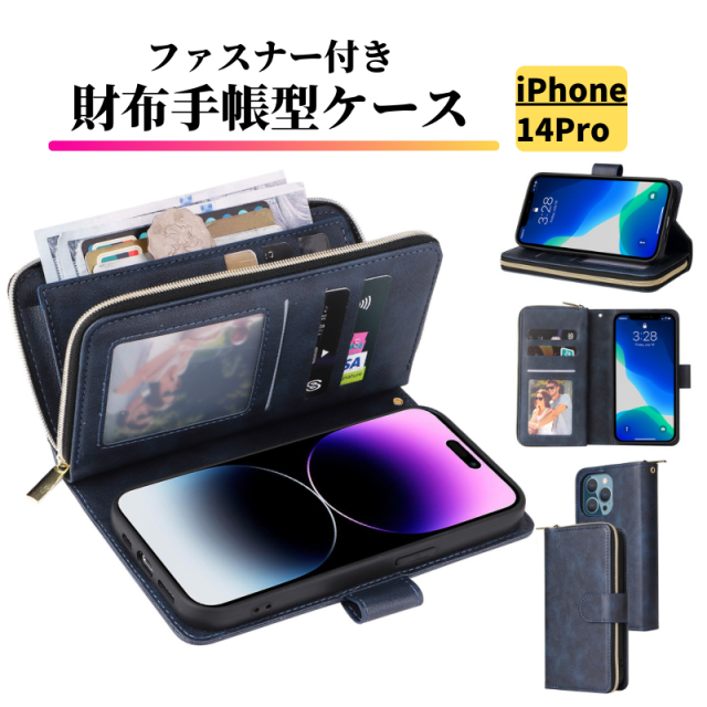 iPhone 14Pro ケース 手帳型 レザー お財布 シンプル カードケース 軽量 カード収納 スタンド ストラップ付 耐衝撃 スマホケース カバー アイフォン iPhone 14 Pro ブルー