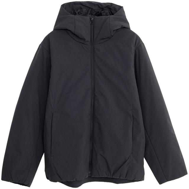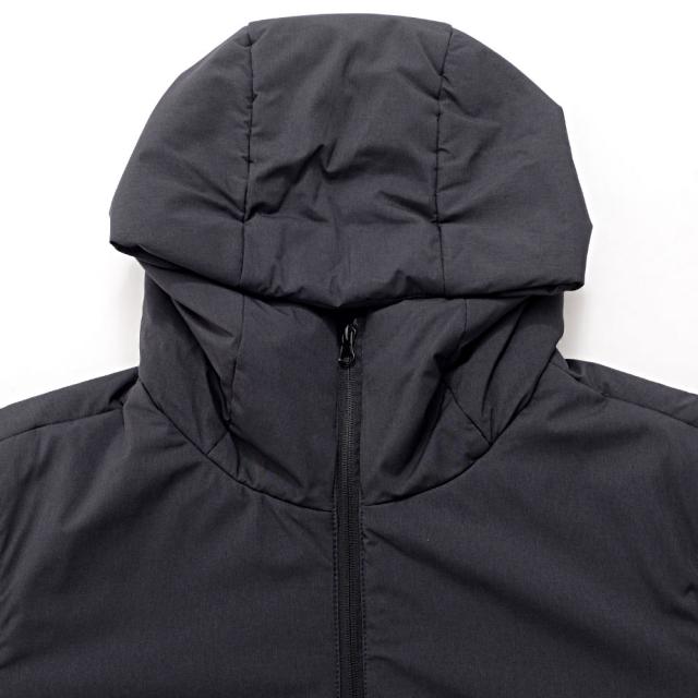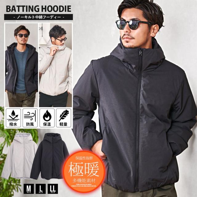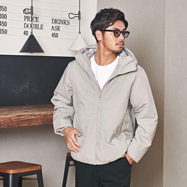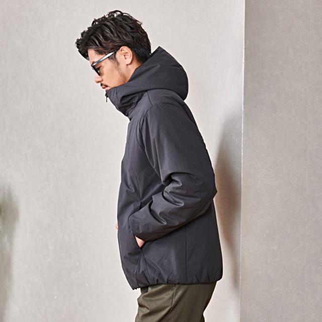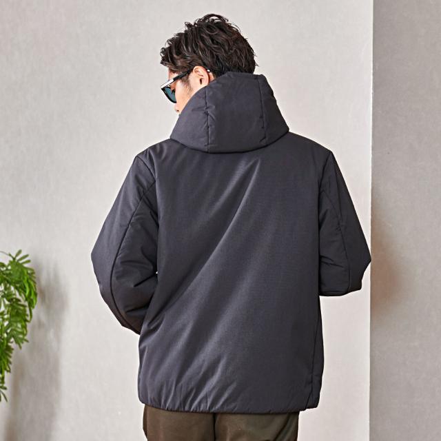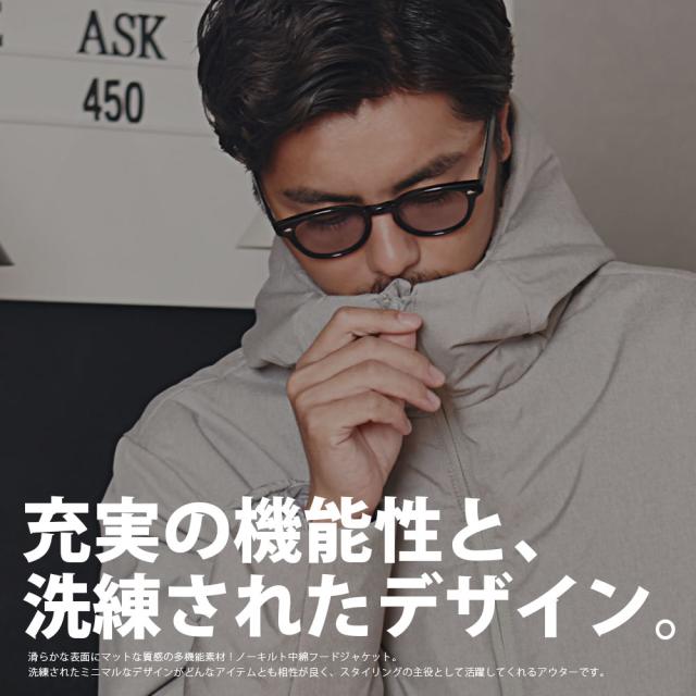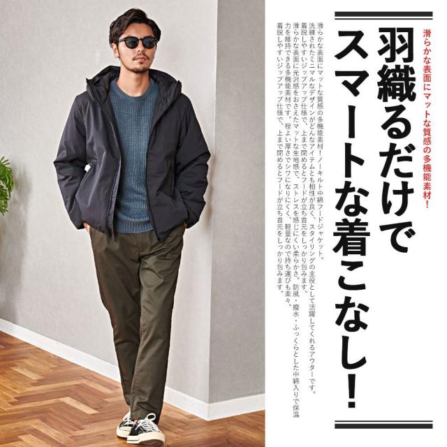 滑らかな表面にマットな質感の多機能素材!ノーキルト中綿フードジャケット。