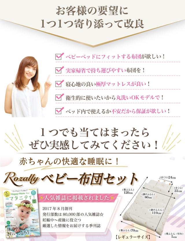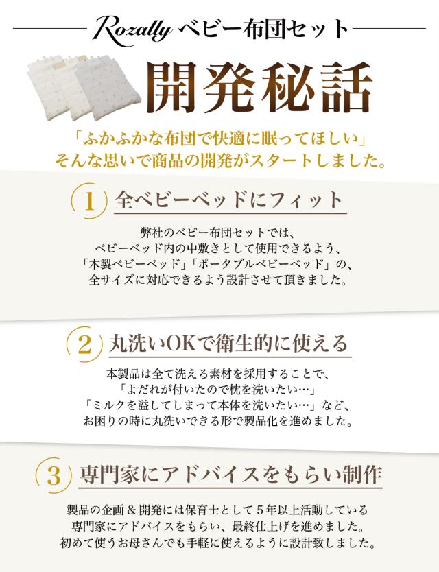 様々なメーカーから ベビー布団や ベビー敷布団 のセットとして” ベビー敷布団 ”が販売されていますが、Rozallyの 敷布団 は”こだわり”が一味違います。 赤ちゃん用品をメインに取り扱っている10社以上の工場からサンプルを取り寄せ、「快適な寝心地×コンパクトな持ち運び」を一緒に試行錯誤して頂けた1社に絞って発注を行なっています。 |