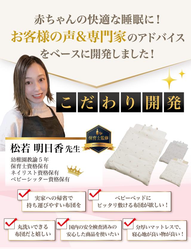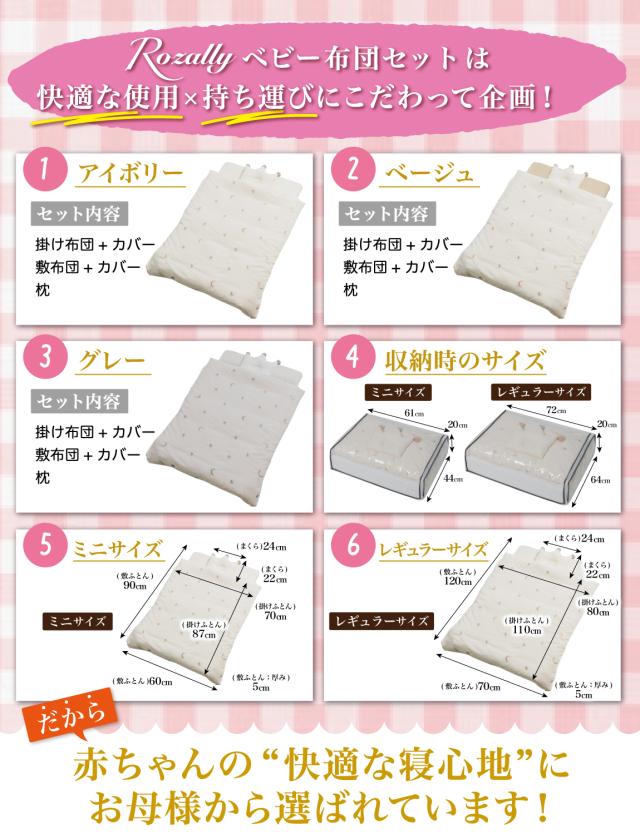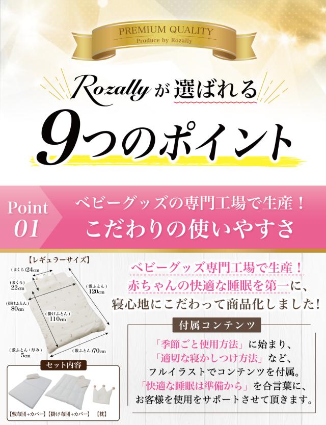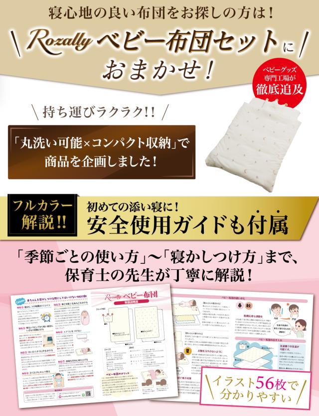 Rozally ベビー布団セット がついに正式販売開始。 「ふかふかな寝心地のベビー布団が欲しい…」というお客様の声から生まれた 「枕」「掛け布団」「敷き布団」「マット」「シーツ」 が1つになったベビー用布団セットです。 コンパクトに収納にして 持ち運び 可能な点も人気の1つです。 幼稚園や保育園のお昼寝で必要になる入園アイテムとしても購入頂いております。 企画&設計では 新生児 や 乳幼児 など 子供 の育児に詳しい【保育士】の先生からアドバイスをもらい、衛生的に使えるよう丸洗い可能な素材選定を行いました。 シンプルで可愛いデザインに仕上げたため出産準備や出産祝いなどギフトにも最適になっています。 |