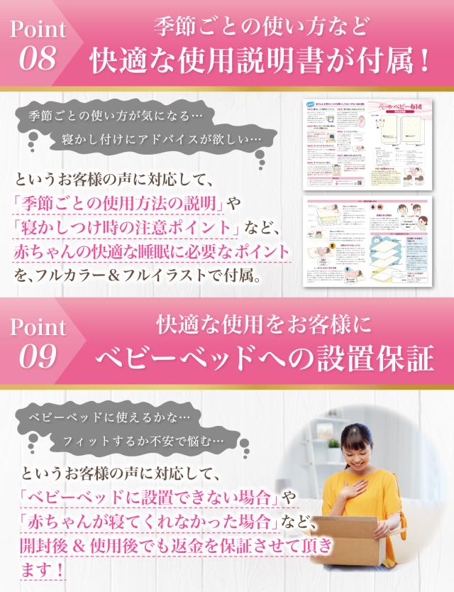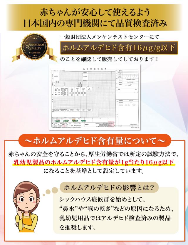 Rozally ベビー布団セットは品質にこだわり、工場と交渉をおこなって素材選定から進めています。 出荷前の検品などは十分に行わせて頂いているのですが、輸送中に破損や汚れは混じってしまうケースがあります。 不具合などが発生してしまった場合でも、製品には1年間の長期保証を付属させて頂いておりますので、すぐに交換品の手配をさせて頂きます。 また本製品には使いやすさや快適さを実感して頂くことを最優先に考え、「2週間ほど使ってみたが寝心地が不満そう…」という場合に、”開封後”でも”使用済み”でも全額の返金保証を付属させて頂いております。 |
