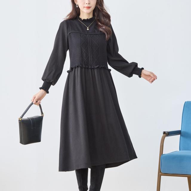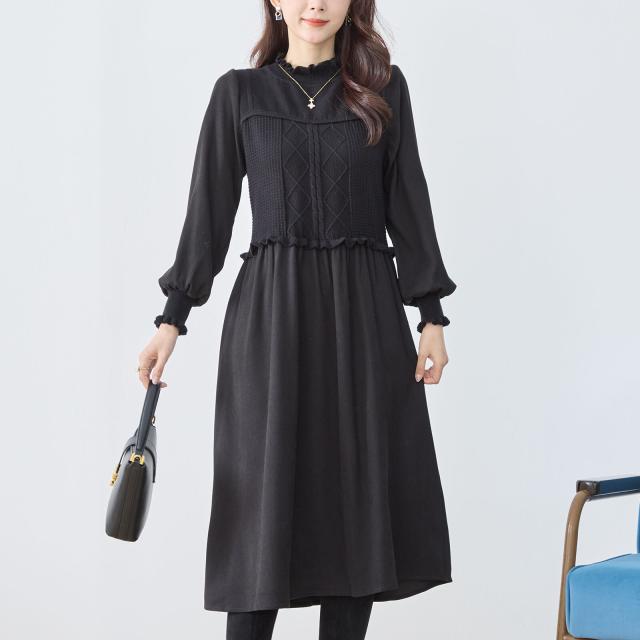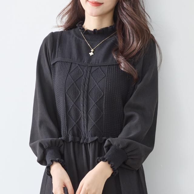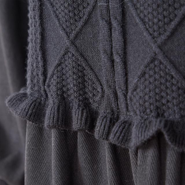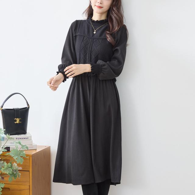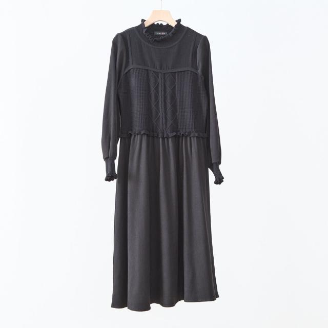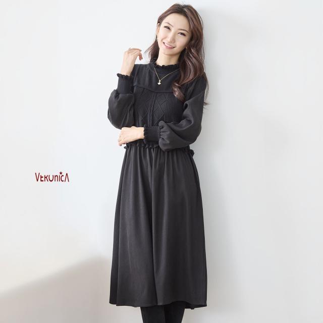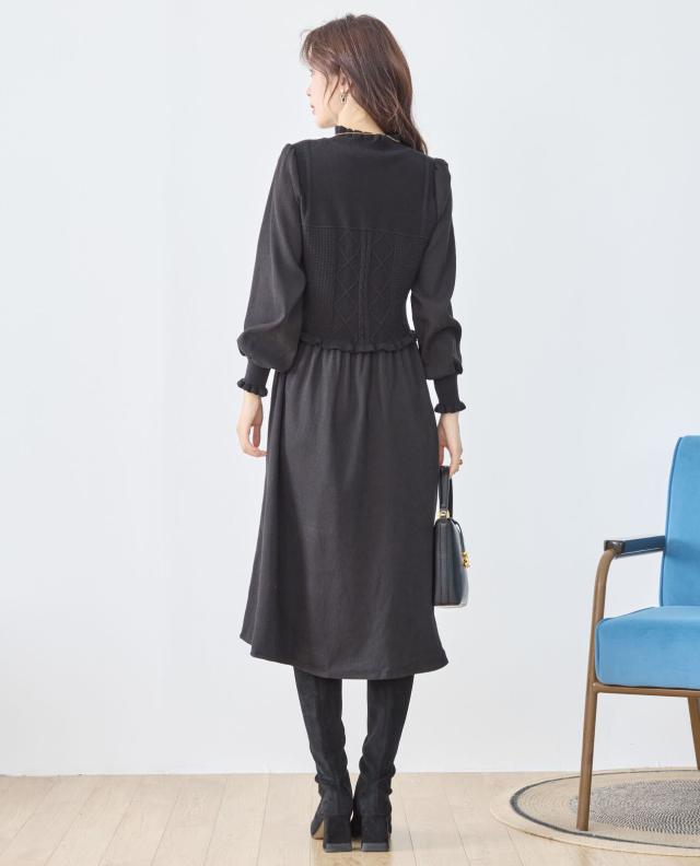 【即納】ニットコンビネーションエレガントワンピース 膝下丈 無地 フェミニン 体型カバー Aライン AW 秋冬 新作
