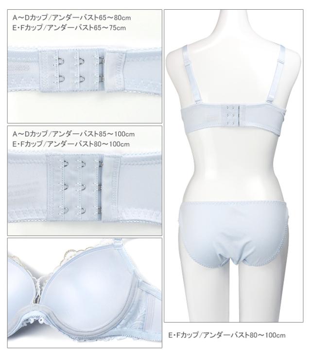 ・ホック:2段3列【A〜Dカップ(アンダーバスト65〜80cm)/ E・Fカップ(アンダーバスト65〜75cm) 】3段3列【A〜Dカップ(アンダーバスト85〜100cm)/ E・Fカップ(アンダーバスト80〜100cm) 】・3/4カップ・ワイヤー入り・肩ストラップ調節可・肩ストラップ取外可・パット内蔵・パットポケットなし