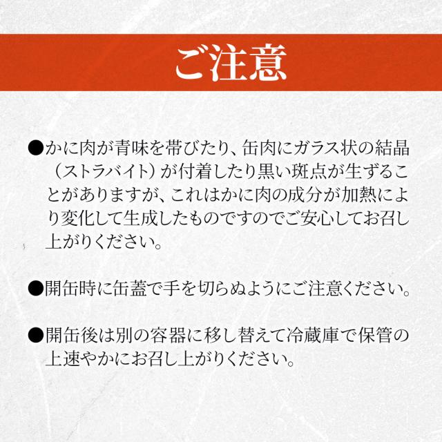 | 原材料 | たらばがに(ロシアまたは北海道)、食塩/調味料(アミノ酸等)、pH調整剤(クエン酸)、酸化防止剤(亜硫酸ナトリウム、V.C)、リン酸塩(Na) |