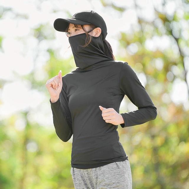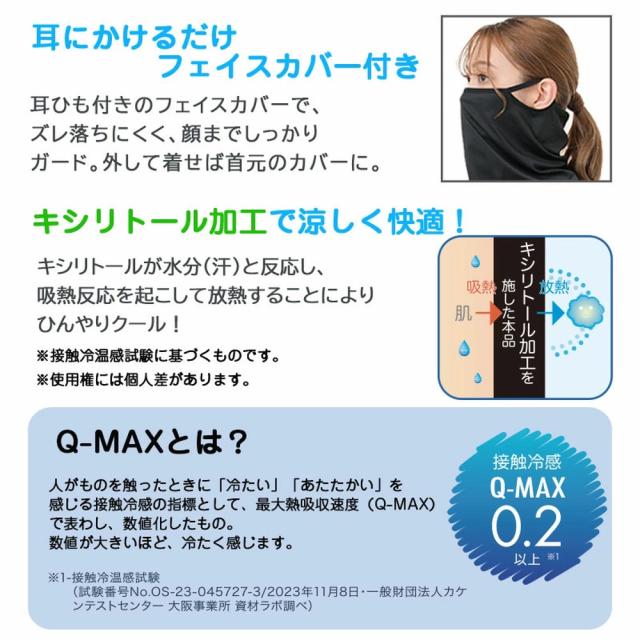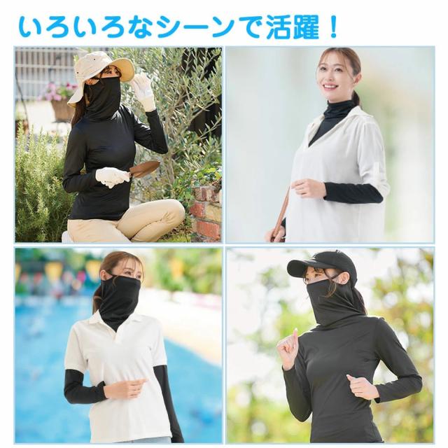 ・耳かけ型フェイスカバーで顔までガード、鼻までしっかりカバー!ループを耳に掛けるだけで鼻まですっぽり覆ってくれて、紫外線から肌をしっかり守ります!フェイスカバーを下ろせばハイネックになり、首元やうなじをガードしてくれます。