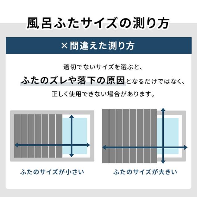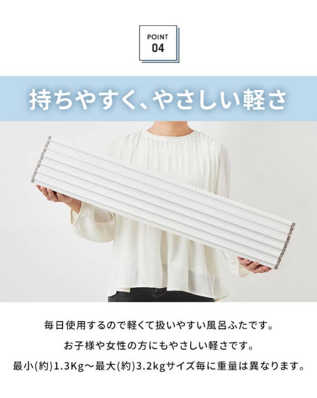 | Ag抗菌折りたたみ式 風呂ふた。 〔POINT〕Ag抗菌加工&防カビ加工 繋ぎ目にAg+銀イオン抗菌加工が施してあり、菌やカビによる嫌なヌメリの繁殖を抑えて風呂ふたをきれいに保ちます。 〔POINT〕フラットな形状でお風呂掃除が簡単 表面・裏面がフラットな形状で軽く洗って水を流せばお掃除完了。 (風呂ふたを洗う際は柔らかいスポンジや中性浴室用洗剤を使用してください。) 〔POINT〕コンパクトにたためてすっきり収納 折りたたみ幅約10センチと場所を取らなず省スペースで収納OK。 パタパタ広げて設置、重ね合わせて収納完了。 〔POINT〕軽量設計 毎日使うものだから軽量でストレスフリーな使い心地。 軽量なのでお子様からお年寄りの方でも簡単に扱えます。 〔POINT〕安心・安全の日本製 【使用上のご注意】 ◎購入直後は折りたたみクセが残っていることがありますが、徐々に解消していきます。 ◎24時間風呂ではご使用をお避け下さい。 ◎風呂水洗浄剤(塩素殺菌剤)をご使用しないでください。 ◎柑橘類(柚子・みかん・レモンなど)を使用しますと風呂ふたを傷める恐れがあります。 ◎ベビーバスなどを風呂ふたに乗せて使用しないでください。 |