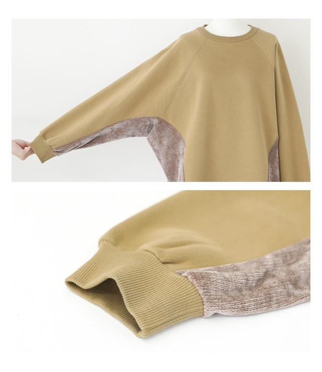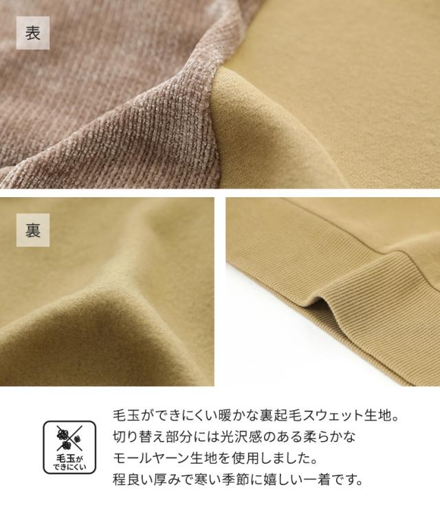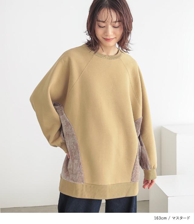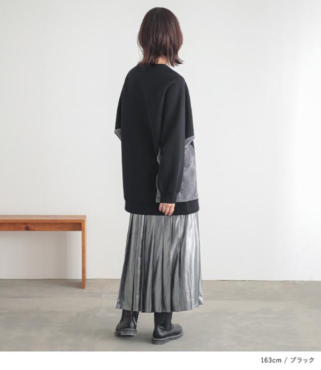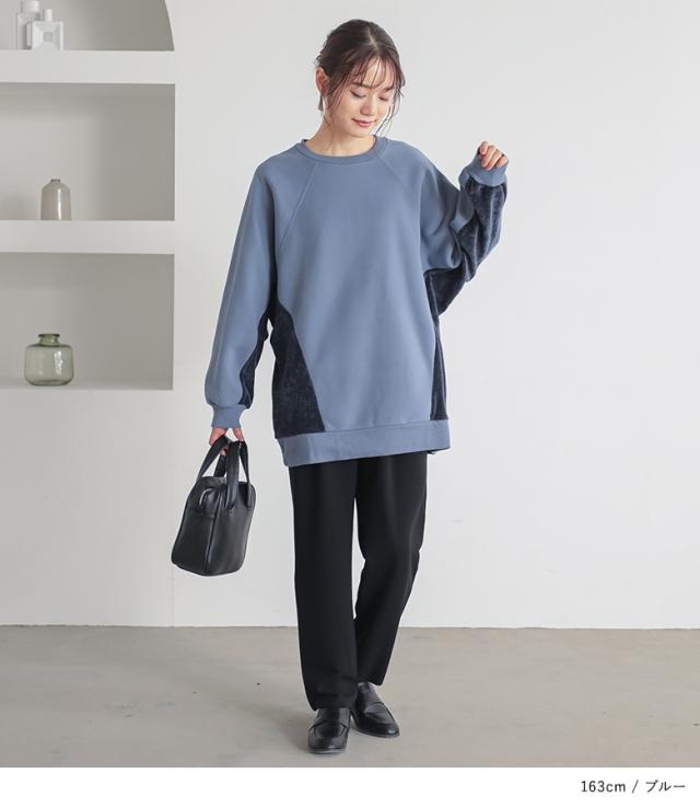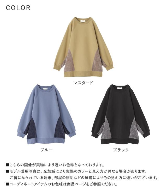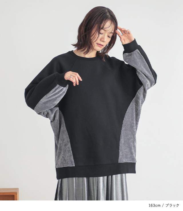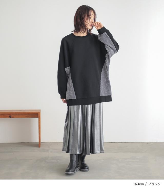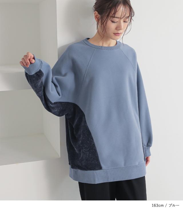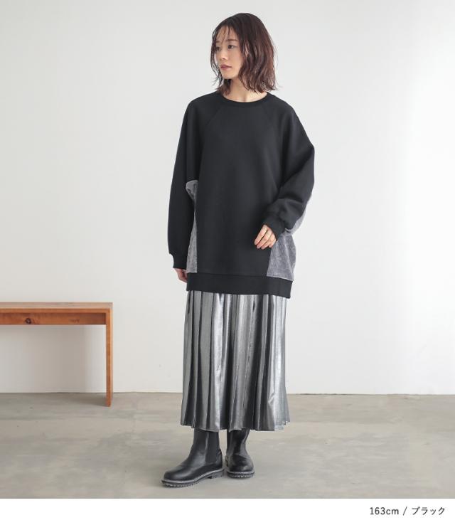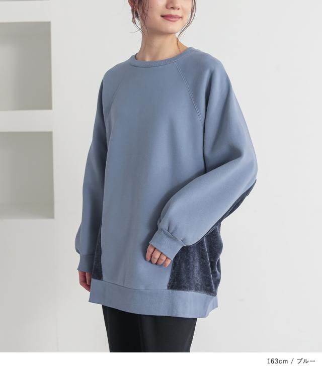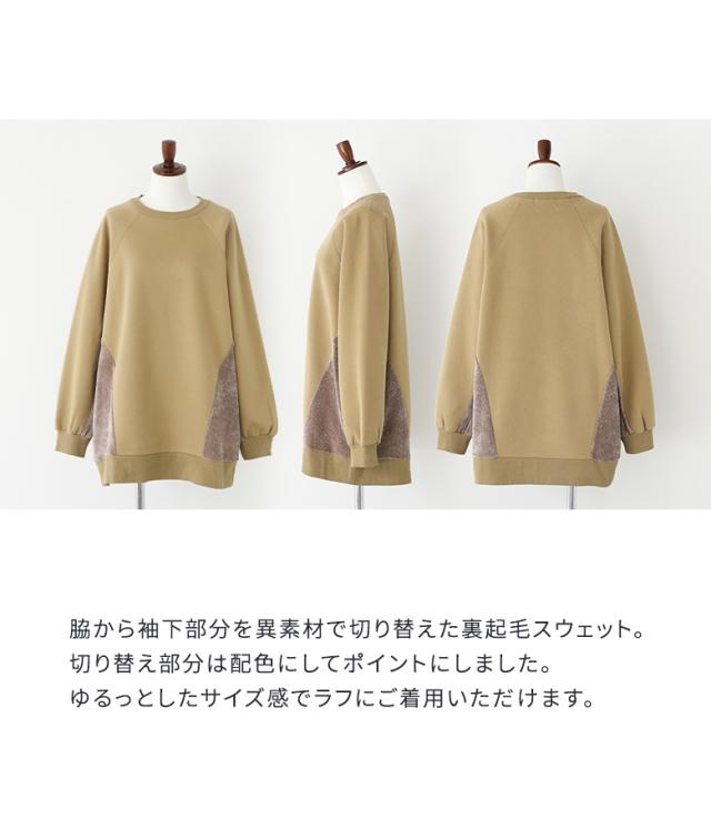 『裏起毛異素材切り替えチュニックスウェット』【メール便不可】【30】[トップス カットトップス カットソー 長袖 レディース スウェット トレーナー 裏起毛 切り替え ゆったり 配色]