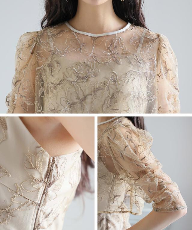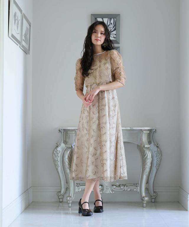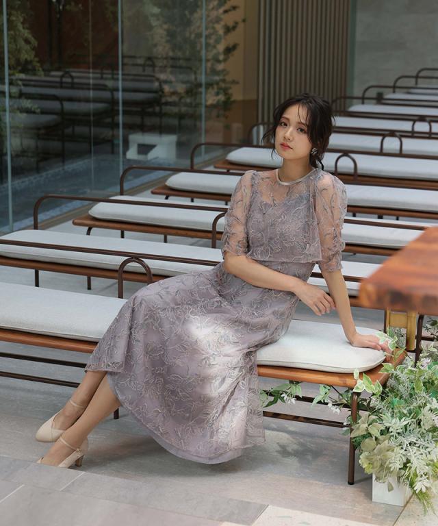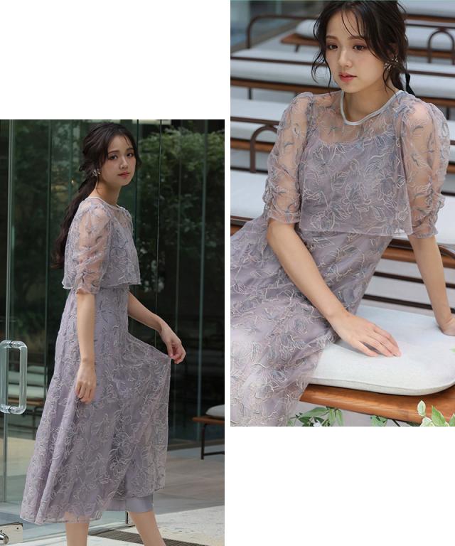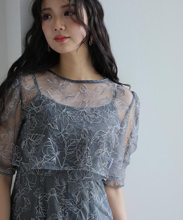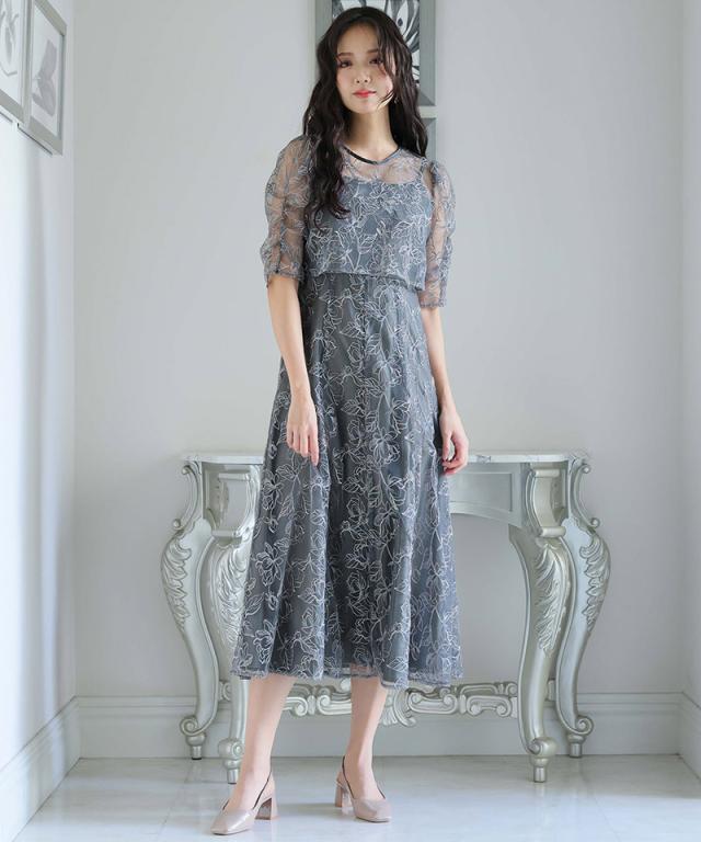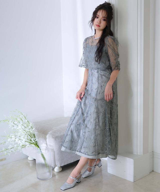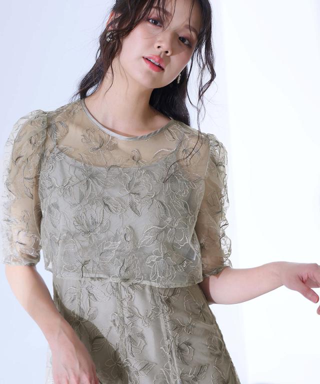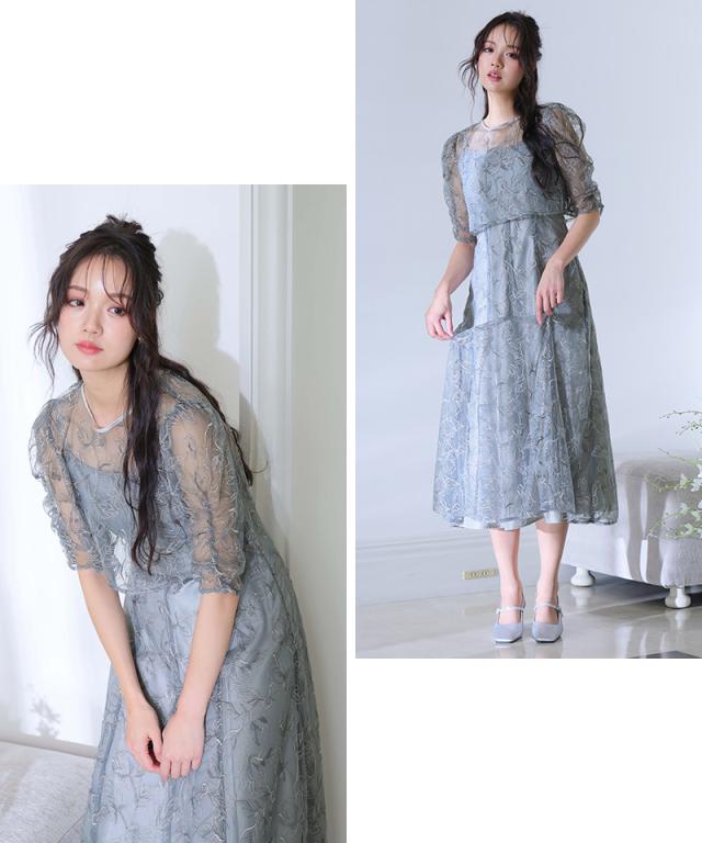 繊細な花柄刺繍レースをふんだんに使用した、エレガントな2ピースドレス。