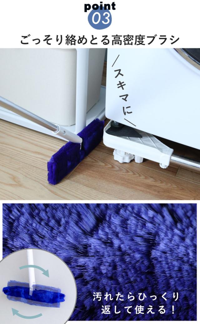 高密度繊維のモップが、細かなホコリまでしっかりキャッチ。360度全面モップで、家具・家電のすき間にもスッと入り込み、溜まった汚れをしっかり落とします。