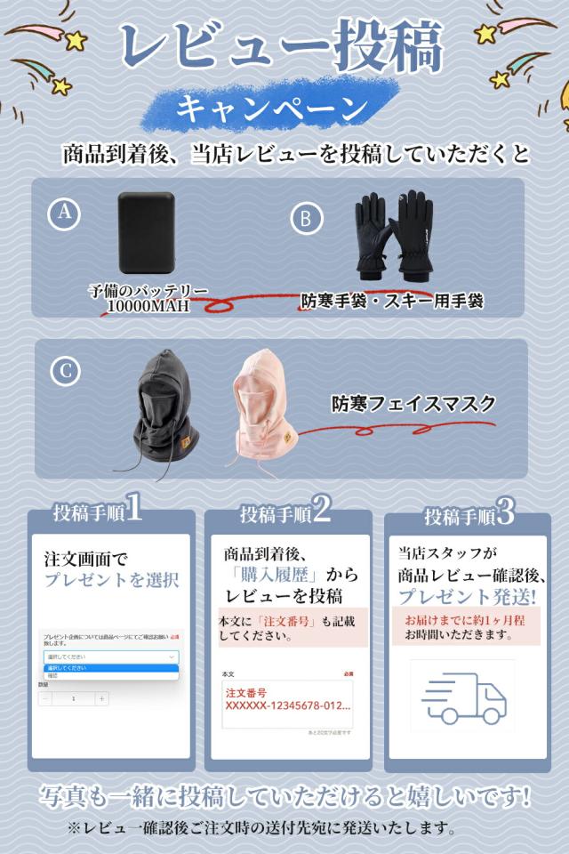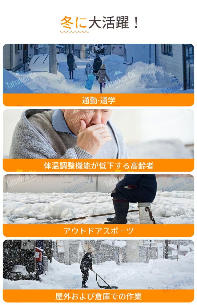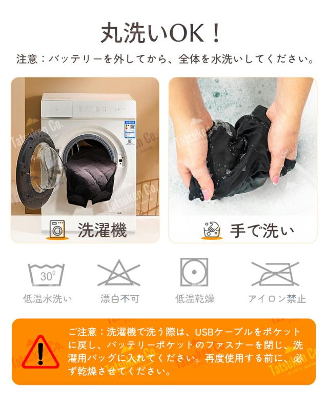 | 【質問】 | 1.質問:品質は高いですか? 回答:弊社のブランドです。発熱効果は市販のベストよりはるかに大きい。制品の多くは関連の検査認証をして、発熱糸も日本制なので、安心して大胆に使用してください。寿命は一般的な発熱ベストの2 ~ 3倍。 2.質問:洗濯しても本当に大丈夫ですか?気を付ける点はありますか? 回答:バッテリーに接続する部分は防水仕様のため水に濡れても大丈夫です。ただし、洗濯後、完全に乾燥 させてからバッテリーと接続して下さい。 洗濯機で洗濯する場合はネットに入れて弱流で洗って下さい。メーカーは手洗いをオススメしております。 洗濯時や手洗い時に、力を入れて強くねじらないで下さい。配線が断線する可能性があります。ご注意 下さい。 洗濯後、完全に自然乾燥させてからご使用下さい。 |