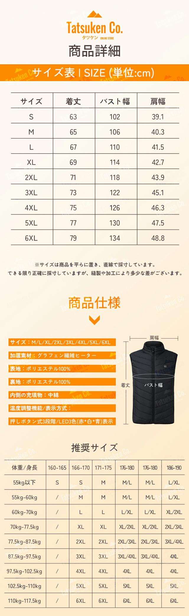 | 製品仕様 | 表地:ポリエステル100% 裏地:ポリエステル100% ヒーター枚数:9枚 加温素材:日本製繊維ヒーター 加熱温度:25℃~50℃ 温度調節:3段(高温/中温/低温) 電圧:USB:5V 電流:USB:2A-2.1A 特徴:大きいサイズ サイズ:S/M/L/XL/2XL/3XL/4XL/5XL/6XL カラー:ブラック/グリーン マーク種類:PSE 商品の仕様は予告なく変更することがあります。 |