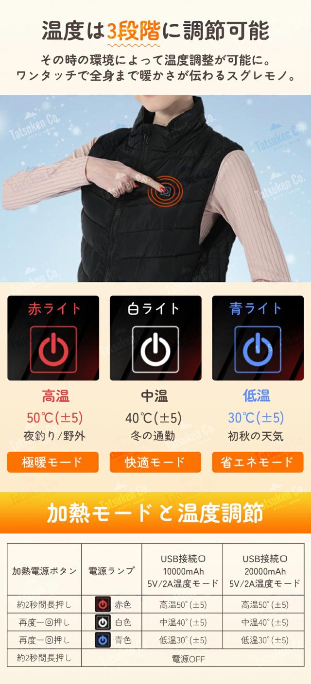 | 使用手順 | 1、ポケット中の内蔵USBプラグをモバイルバッテリーと接続する。 2、胸部の電源ボタンを2秒ほど長押しすると、ベストは予熱を開始する。 3、ボタンを短く押す度に、赤(高温)白(中温)青(低温)へと切り替わり、お好みの温度/温めたい箇所を選択してください。 4、電源を切りたいときは、温めた箇所のボタンが消点するまで長押ししてください。 説明書:電熱ベストの取り扱い説明書を一緒にお送りします。さらに使いやすくなります。 |