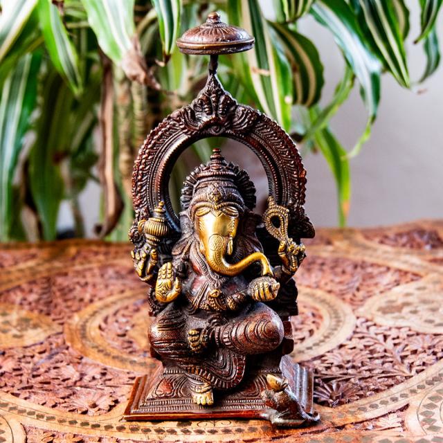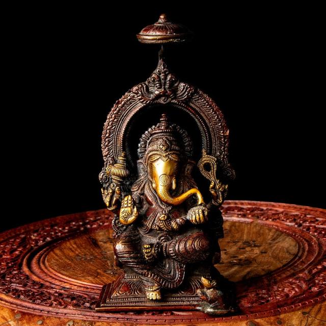 天蓋ガネーシャ 坐像 重厚なブラス製 高さ22cm程度 / ガナパティ、ガネーシュ、仏像、神像 インドとアジア雑貨 【インドとアジアン雑貨