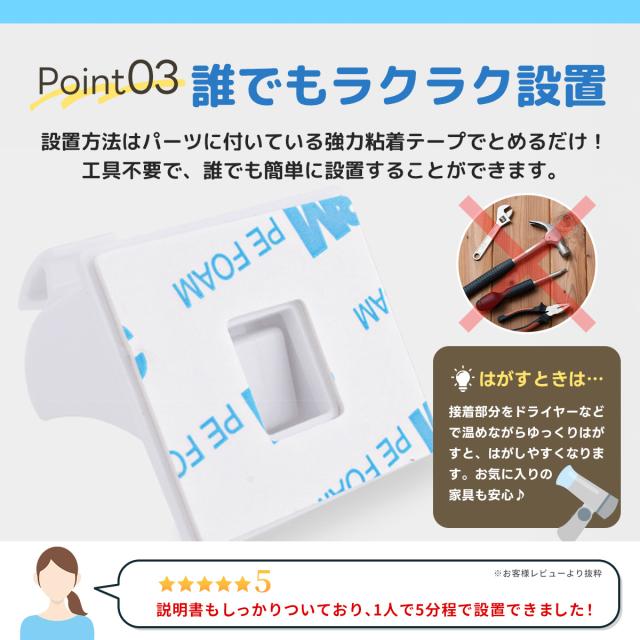 ・設置方法はパーツに付いている強力粘着テープでとめるだけ!工具不要で、誰でも簡単に設置することができます。