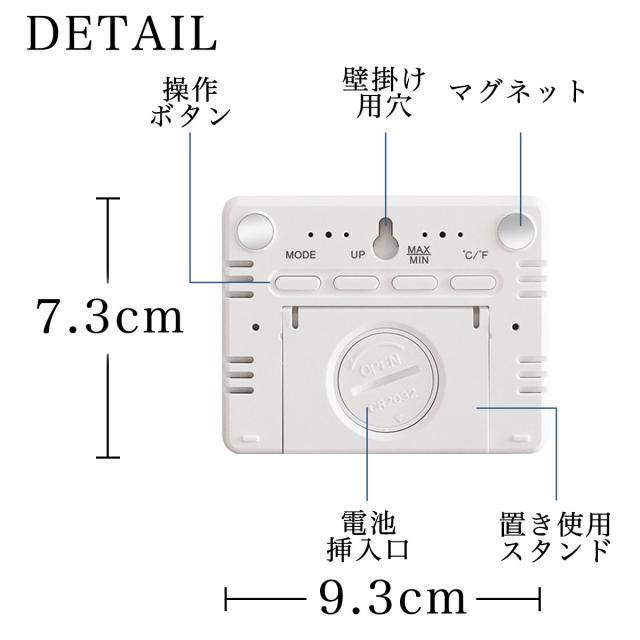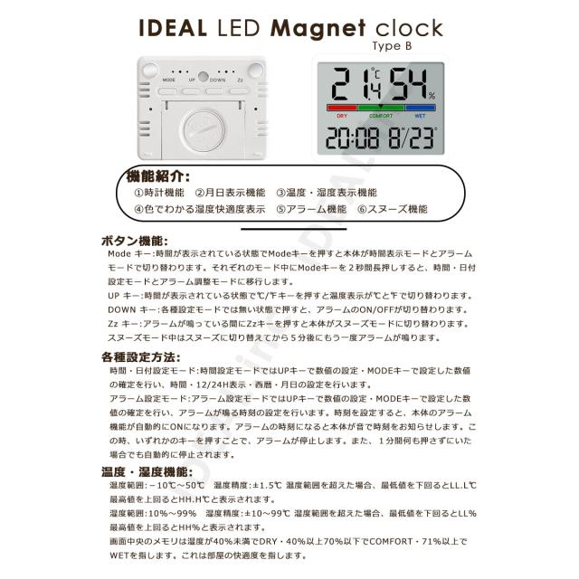 | 多機能&スタイリッシュ!毎日の生活をよりスマートにするデジタルクロック このデジタルクロックは、シンプルで見やすい表示と多機能性を兼ね備えています。 インテリアにも馴染むスタイリッシュなデザインで、どんなお部屋にもぴったり。 時間だけでなく、温度や湿度もひと目で確認でき、日々の快適な生活をサポートします。 主な特徴: マグネット&スタンド付き:冷蔵庫やデスク、ベッドサイドにも簡単に設置可能。 大画面LCD表示:時間、温度、湿度を一目で確認できる見やすさ。 多機能:目覚ましアラーム、スヌーズ機能付きで忙しい朝も安心。 軽量&コンパクト:持ち運びにも便利。旅行やオフィスでも活躍。 シンプル操作:直感的に使える設計で誰でも簡単に設定可能。 この時計は、現代の生活に必要な機能をすべて揃えた万能アイテム。デザイン性と実用性を兼ね備えたこの時計で、よりスマートな毎日を始めませんか? ※商品付属の説明書は英文となります。必ずWEBマニュアル(日本語)を プリントアウトしてご利用ください |