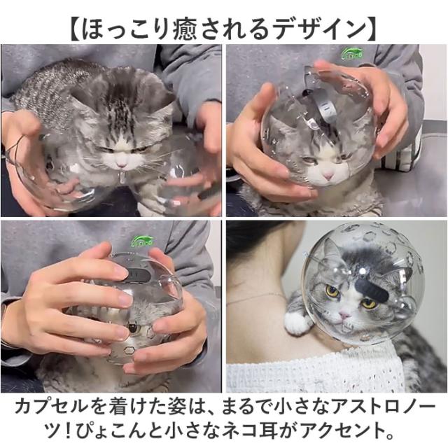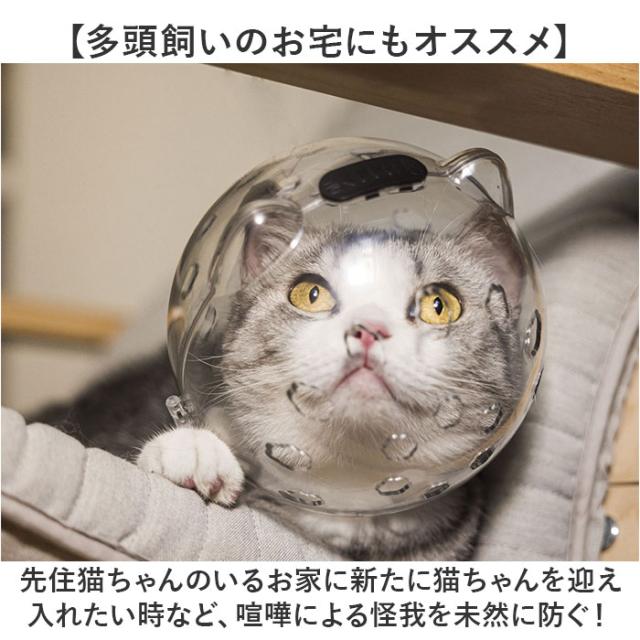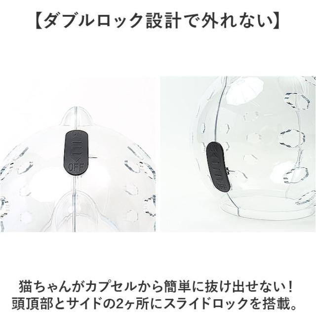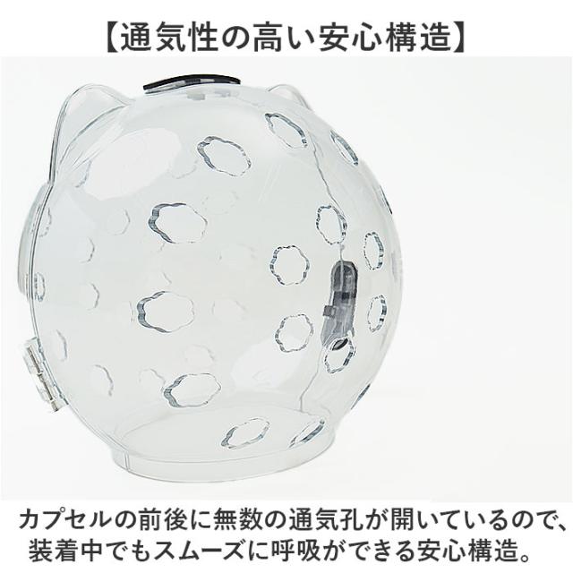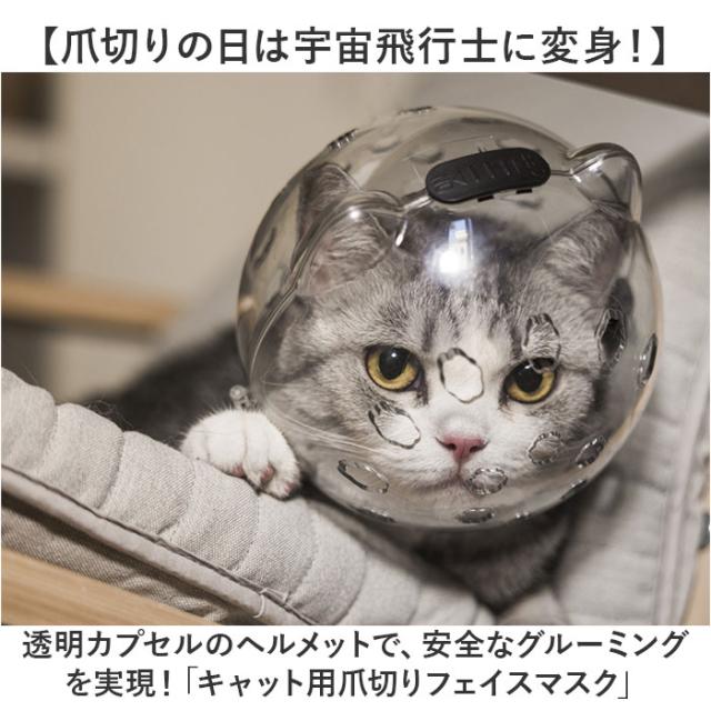 | 商品説明 | 【爪切りの日は宇宙飛行士に変身!】 ・透明カプセルのヘルメットで、安全なグルーミングを実現!「キャット用爪切りフェイスマスク」 【猫ちゃんが怖がらない透明タイプ】 ・装着時に愛猫の視線を妨げない、コロンと丸い透明カバーを採用。爪切り時の不安や怯えを軽減。 【通気性の高い安心構造】 ・カプセルの前後に無数の通気孔が開いているので、装着中でもスムーズに呼吸ができる安心構造。 【ダブルロック設計で外れない】 ・猫ちゃんがカプセルから簡単に抜け出せない!頭頂部とサイドの2ヶ所にスライドロックを搭載。 【グルーミング中の咬みつき防止】 ・爪切りやワクチン接種、トリミングサロンのカットが苦手な猫ちゃんから、飼い主さんの手をガード。 【キズ舐め防止にも効果的】 ・手術後や怪我で治療中の愛猫が、患部を舐めないように保護するエリザベスカラーとしても大活躍! 【多頭飼いのお宅にもオススメ】 ・先住猫ちゃんのいるお家に新たに猫ちゃんを迎え入れたい時など、喧嘩による怪我を未然に防ぐ! 【パカッと被せて、簡単装着!】 1.予めロックを外した透明カプセルを両手のひらで支えながら、2つの半球体状に左右に広げる。 2.開いた状態のカプセルを、猫ちゃんの頭を包み込むように前後からパカッと被せる。 3.頭頂部とサイドの黒いロックボタンを「OFF」の方向にスライドさせたら装着完了! 【ほっこり癒されるデザイン】 ・カプセルを着けた姿は、まるで小さなアストロノーツ!ぴょこんと小さなネコ耳がアクセント。 |