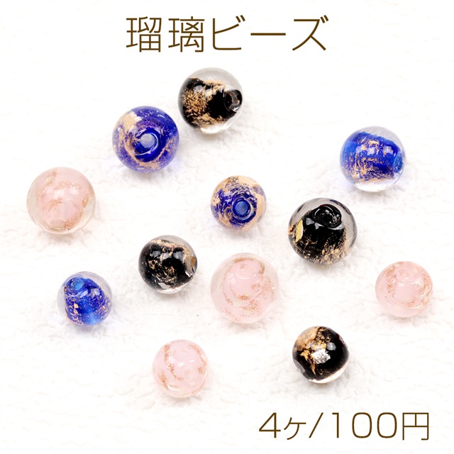 瑠璃ビーズ 琉璃ビーズ るりビーズ 一つずつ手作りガラスビーズ 金箔入り 丸玉ガラスビーズ 全3色 3サイズ (4ヶ)