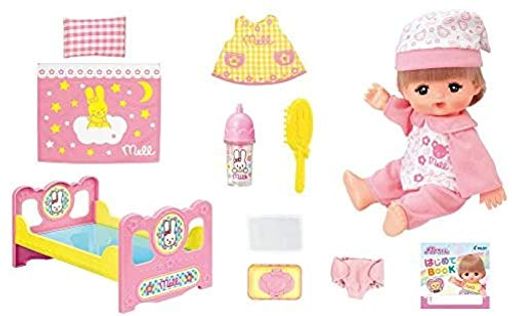 セット内容:ショートヘアメルちゃん(パンツ付)、パジャマ上下、ぼうし、ワンピース、おむつ、ベッド、おふとん、まくら、おしりふきケース・おしりふき、ミルクびん、ブラシ、ミニブック