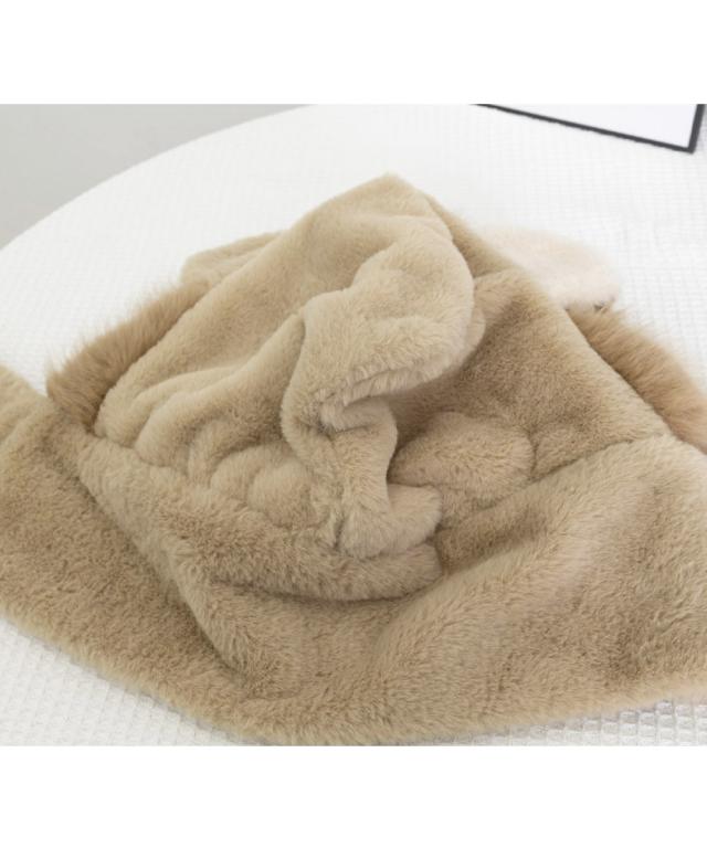帽子とマフラーが一体化した、首元まで暖かく包み込むファー付きボア帽子。