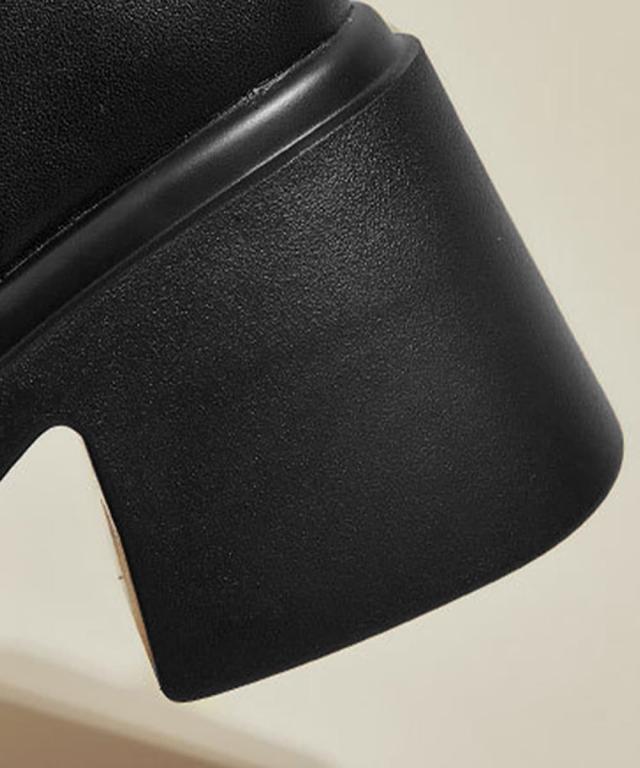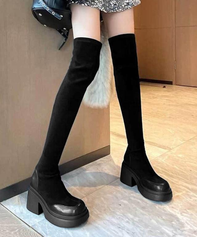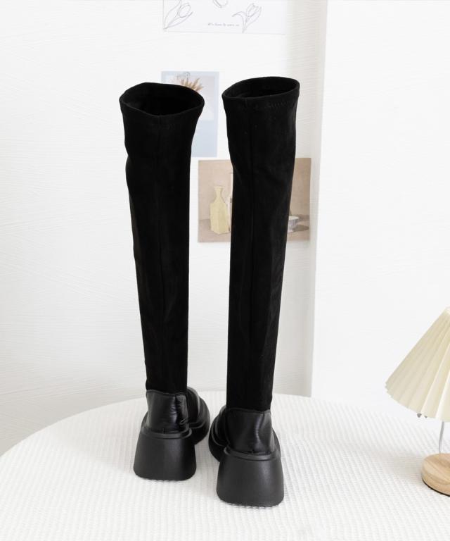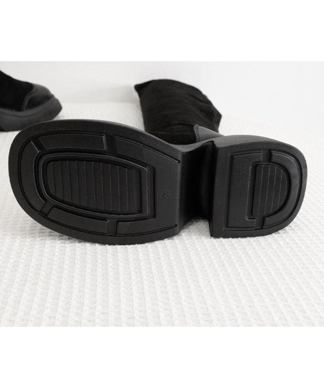異素材をミックスした、個性あふれるデザインのスタイリッシュなニーハイブーツ。
