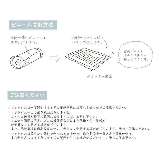 備考 マットレスは一度開封すると元の圧縮状態には戻れませんのでご注意ください。商品の色味はモニターの機種や設定により実際の商品と異なる場合があります。予めご了承ください。商品の仕様は予告なく変更になる場合がございます。