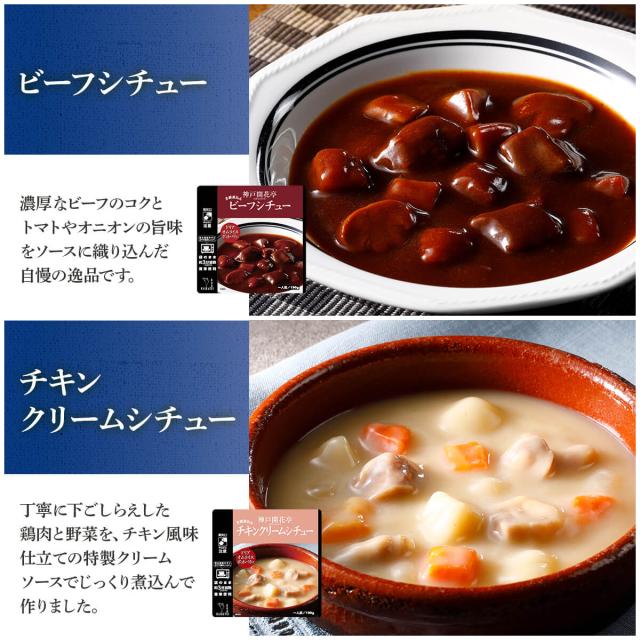 | 内容量 | 煮込みハンバーグ デミグラスソース 190g 煮込みハンバーグ トマトソース 190g 煮込みハンバーグ てりやきソース 190g ビーフシチュー 190g チキンクリームシチュー 190g 5種 各2食 合計10食 |