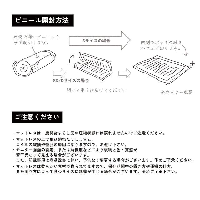 備考 マットレスは一度開封すると元の圧縮状態には戻れませんのでご注意ください。商品の色味はモニターの機種や設定により実際の商品と異なる場合があります。予めご了承ください。商品の仕様は予告なく変更になる場合がございます。