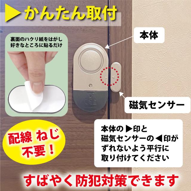 ●本体と磁気センサーが1.5cm以上離れると、大きな警告音が鳴る最強防犯グッズ!電池式で配線不要。ネジ不要。ドアや窓に付属のテープでかんたん取り付け、すぐに防犯対策ができます。