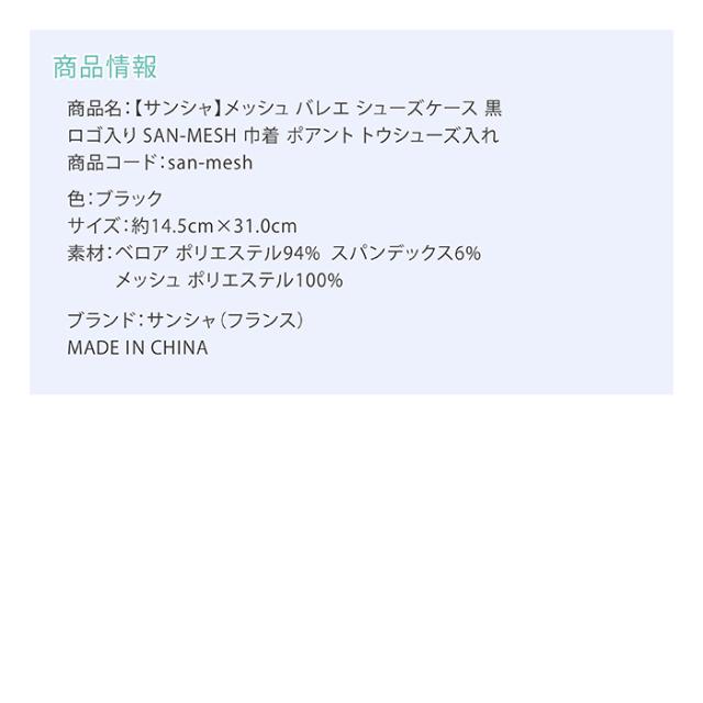 商品名:【サンシャ】メッシュ バレエ シューズケース 黒 ロゴ入り SAN-MESH 巾着 ポアント トウシューズ入れ