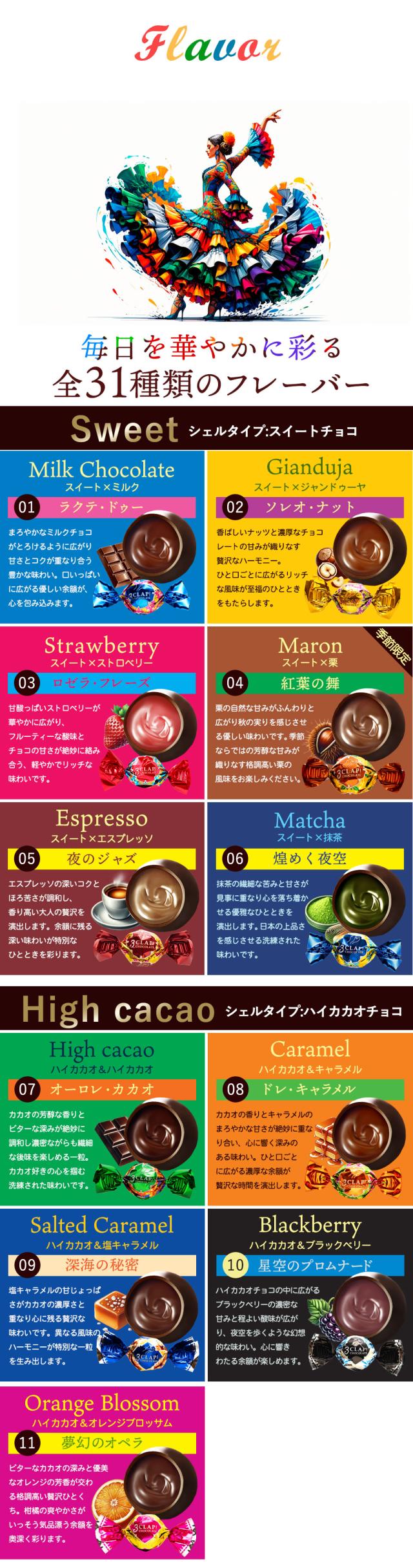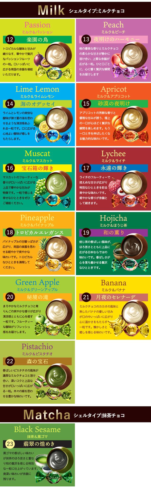 <スイート> ●ラクテ・ドゥー:砂糖(タイ・他)、カカオマス、ココアバター、クリーム、全粉乳、バター、水あめ、リキュール/乳化剤、香料(一部に乳成分・オレンジ・大豆を含む) ●ソレオ・ナット:砂糖(タイ・他)、ココアバター、カカオマス、クリーム、ヘーゼルナッツペースト、全粉乳、アーモンドペースト、バター、乳糖、全粉乳、植物油脂/乳化剤、香料(一部に乳成分・アーモンド・大豆を含む) ●ロゼラ・フレーズ:砂糖(タイ・他)、ココアバター、クリーム、カカオマス、乳糖、全粉乳、バター、水あめ、ストロベリーパウダー、いちご、リキュール/乳化剤、着色料(ビートレッド、赤40)、酸味料、香料(一部に乳製品・大豆を含む) ●紅葉の舞:砂糖(外国製造)、クリーム、ココアバター、カカオマス、くりパウダー、植物油脂、全粉乳、バター、水あめ、リキュール、乳糖、酒かすパウダー/乳化剤、香料着色料(カラメル、クチナシ)、加工デンプン、(一部に乳成分・大豆を含む) ●夜のジャズ:砂糖(タイ・他)、ココアバター、クリーム、カカオマス、全粉乳、脱脂粉乳、バター、水あめ、リキュール、コーヒー、濃縮コーヒーエキス/乳化剤、香料着色料(カロテノイド)、(一部に乳成分・オレンジ・大豆を含む) ●煌めく夜空:砂糖(タイ・他)、ココアバター、クリーム、カカオマス、乳糖、全粉乳、バター、水あめ、宇治抹茶、リキュール/乳化剤、香料(一部に乳成分・大豆を含む) <ハイカカオ> ●オーロレ・カカオ:カカオマス(外国製造)、砂糖、クリーム、ココアバター、バター、水あめ、リキュール、全粉乳/乳化剤、香料(一部に乳成分・オレンジ・大豆を含む) ●ドレ・キャラメル:カカオマス(外国製造)、砂糖、クリーム、ココアバター、全粉乳、バター、水あめ、脱脂粉乳、キャラメルパウダー、リキュール、乳糖、タンパク質濃縮ホエイパウダー/乳化剤、着色料(カラメル)、香料(一部に乳成分・オレンジ・大豆を含む) ●深海の秘密:カカオマス(外国製造)、砂糖、クリーム、ココアバター、全粉乳、バター、水あめ、脱脂粉乳、キャラメルパウダー、リキュール、乳糖、たんぱく質濃縮ホエイパウダー、塩/乳化剤、着色料(カラメル)、香料(一部に乳成分・大豆・オレンジを含む) ●星空のプロムナード:カカオマス(外国製造)、砂糖、ココアバター、クリーム、乳糖、ブラックベリー、全粉乳、バター、水あめ、リキュール/乳化剤、香料(一部に乳製品・大豆を含む) ●夢幻のオペラ:カカオマス(外国製造)、砂糖、ココアバター、クリーム、全粉乳、オレンジ、バター、水あめ、スピリッツ/乳化剤、食用油脂、香料ベース、香料グリセリン脂肪酸エステル、エタノール、(一部に乳成分・オレンジ・大豆を含む) <ミルク> ●楽園の鳥:ココアバター(インドネシア・他)、砂糖、全粉乳、クリーム、乳糖、パッションフルーツ、カカオマス、バター、水あめ、リキュール/乳化剤、香料(一部に乳成分・大豆を含む) ●夜明けのハーモニー:ココアバター(インドネシア・他)、砂糖、全粉乳、クリーム、乳糖、白桃、カカオマス、バター、水あめ、リキュール/乳化剤、香料(一部に乳成分・もも・オレンジ・大豆を含む) ●海のオデッセイ:ココアバター(インドネシア・他)、砂糖、全粉乳、クリーム、乳糖、レモン、カカオマス、バター、水あめ、ライム、リキュール/乳化剤、香料(一部に乳成分・オレンジ・大豆を含む) ●砂漠の夜明け:ココアバター(インドネシア・他)、砂糖、全粉乳、クリーム、乳糖、杏、カカオマス、バター、水あめ、リキュール/乳化剤、香料酸味料、(一部に乳成分・大豆を含む) ●宝石箱の輝き:砂糖(タイ・他)、ココアバター、全粉乳、クリーム、乳糖、カカオマス、水あめ、マスカット果汁シロップ、バター、果糖ブドウ糖液糖、リキュール、ブドウ果汁、デンプン/香料乳化剤、着色料(ベニバナ黄、クチナシ青、クチナシ黄)、酸味料、増粘剤(カラギナン、ペクチン、キサンタンガム、加工デンプン)、デンプン分解物、ビタミンC、(一部に乳・大豆・オレンジを含む) ●永遠の輝き:ココアバター(インドネシア・他)、砂糖、全粉乳、クリーム、乳糖、ライチ、カカオマス、バター、水あめ、リキュール/乳化剤、香料(一部に乳成分・オレンジ・大豆が含まれる) ●トロピカルエレガンス:ココアバター(インドネシア・他)、砂糖、全粉乳、クリーム、乳糖、パインアップル、カカオマス、バター、水あめ、リキュール/乳化剤、香料(一部に乳成分・オレンジ・大豆を含む) ●和の薫り:ココアバター(インドネシア・他)、砂糖、全粉乳、クリーム、乳糖、カカオマス、バター、水あめ、ほうじ茶パウダー、リキュール/乳化剤、香料(一部に乳成分・オレンジ・大豆を含む) ●秘境の滝:ココアバター(インドネシア・他)、砂糖、全粉乳、クリーム、乳糖、青りんご、カカオマス、バター、水あめ、リキュール/乳化剤、香料酸味料(クエン酸)、酸化防止剤(ビタミンC)、(一部に乳成分・りんご・オレンジ・大豆を含む) ●月夜のセレナー