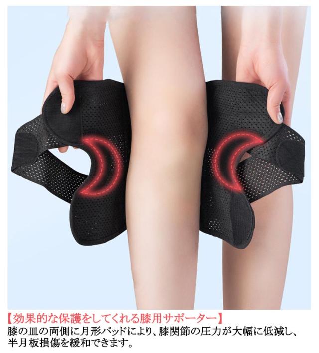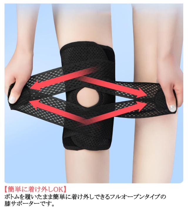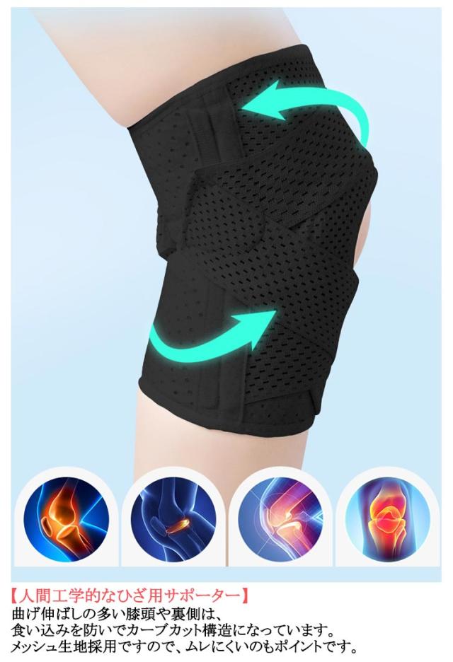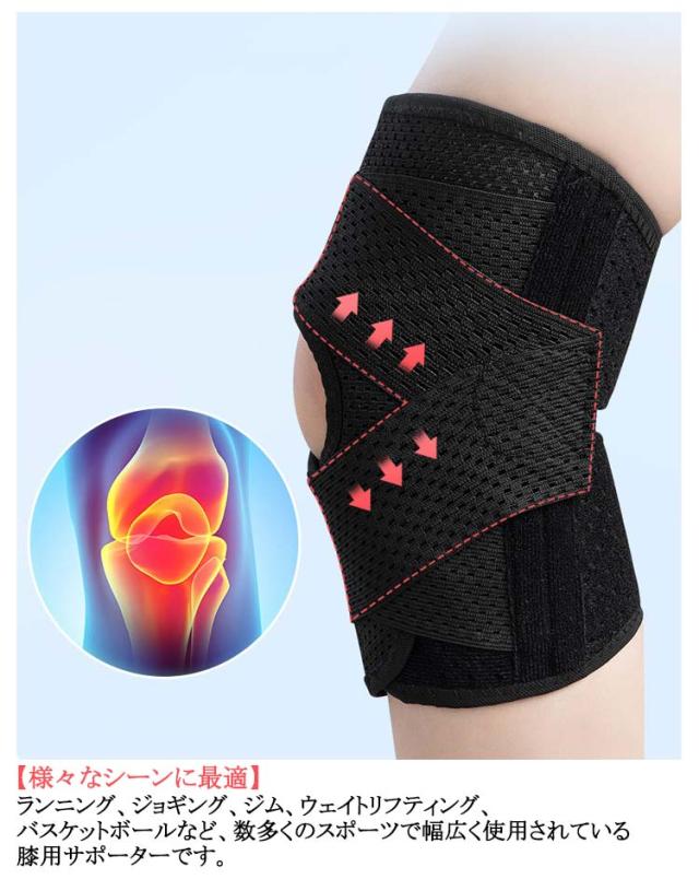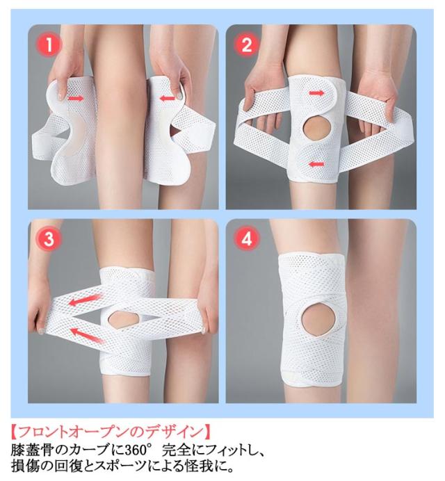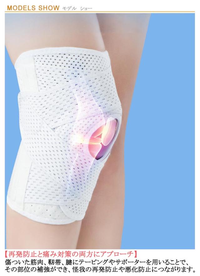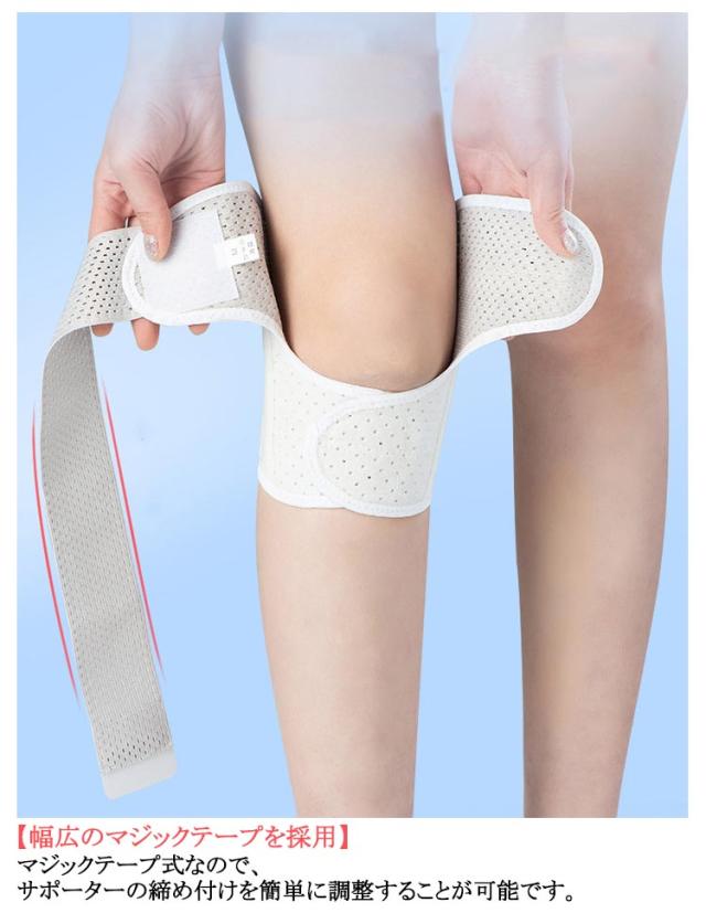 | サイズについての説明 | Mおすすめ体重40-55kg Lおすすめ体重55-70kg XLおすすめ体重70-85kg 着用方法: 1.膝を伸ばした状態で、膝の裏側からサポーター本体を当てます。 2.膝を屈する時、サポーターの穴を膝のお皿の位置に合わせて、上下側の面ファスナーを引っ張り、サポーター本体にとめます。 3.加圧ベルトを後ろにまわし、膝下に当ててクロスさせます。 4.ベルト止めで固定します。 【いつでも快適な着用感】このひざサポーターは通気性、吸汗速乾性に優れ、汗をかいてもサラッと快適です。 |